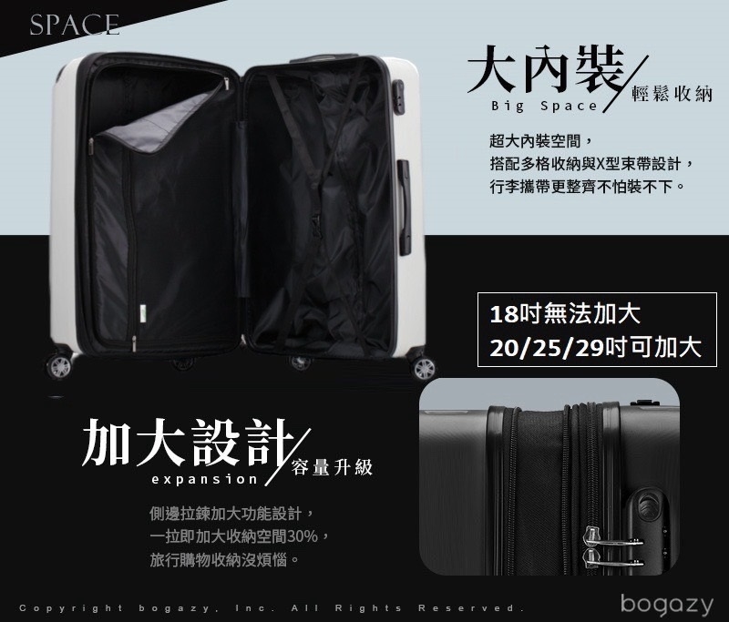 18 吋約 - 31.5*20*47 cm,約 2.3 kg (無加大功能)