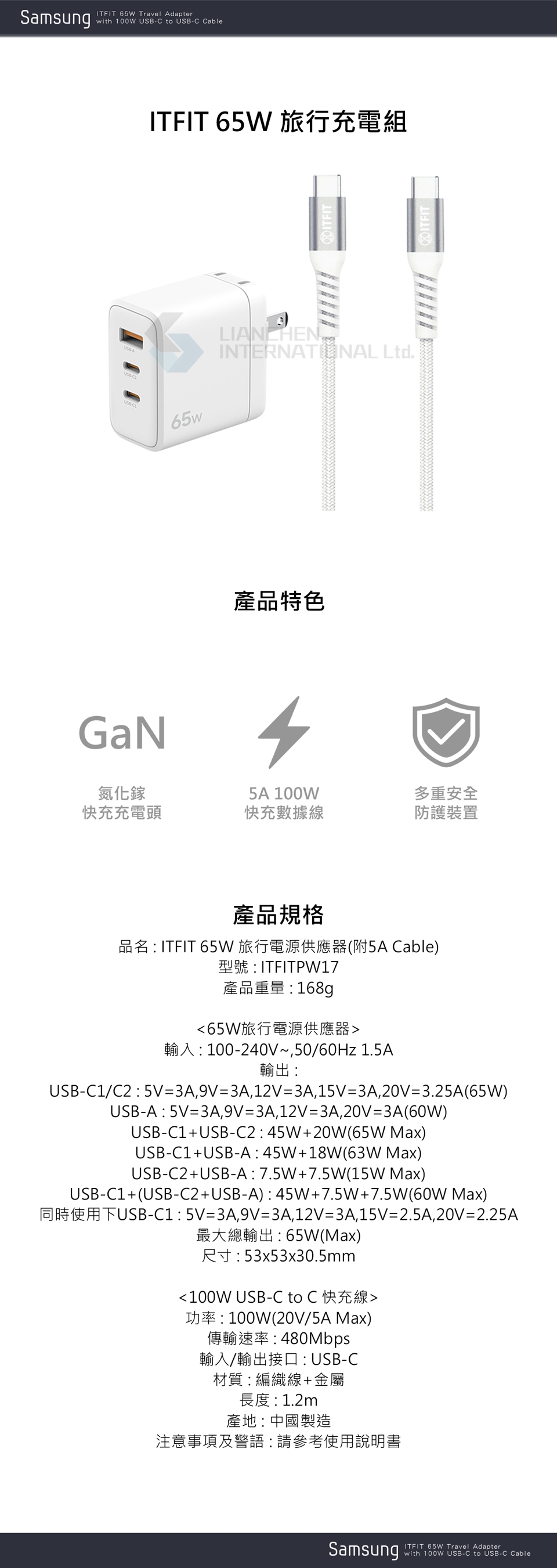 品名:ITFIT 65W GaN三孔+100W 5A 雙Type-C 快充組