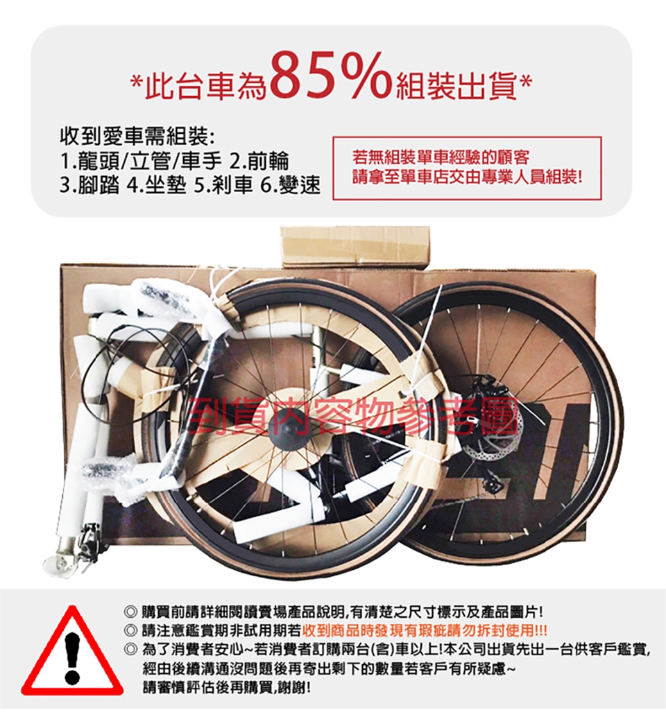 若沒有組裝單車經驗的顧客 請將車拿至車店交由專業人員組裝!