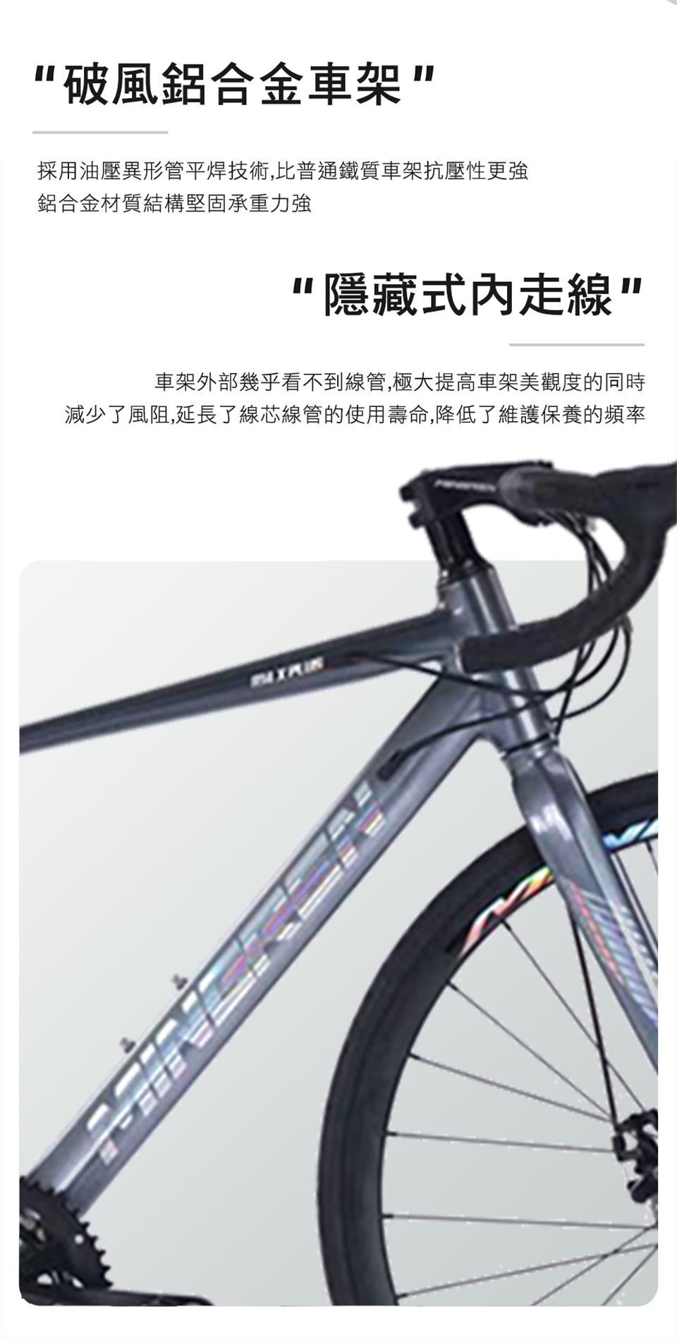 車架:破風鋁合金,輕量化,油壓異形管平焊,(隱藏室式內走線)架高465mm