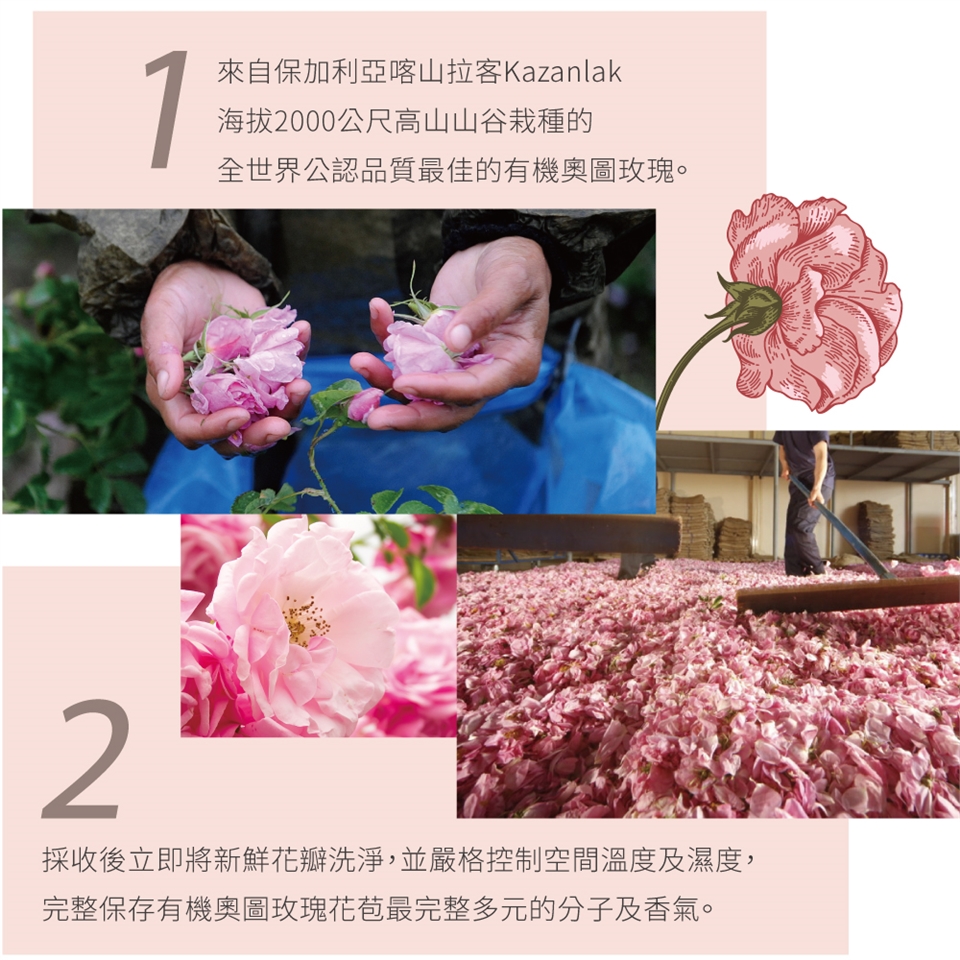 玫瑰純露:自然植物萃取因素,每批產品顏色可能會有些許色差,植物沉澱屬正常現象;皮膚異常時請停止使用與就醫。