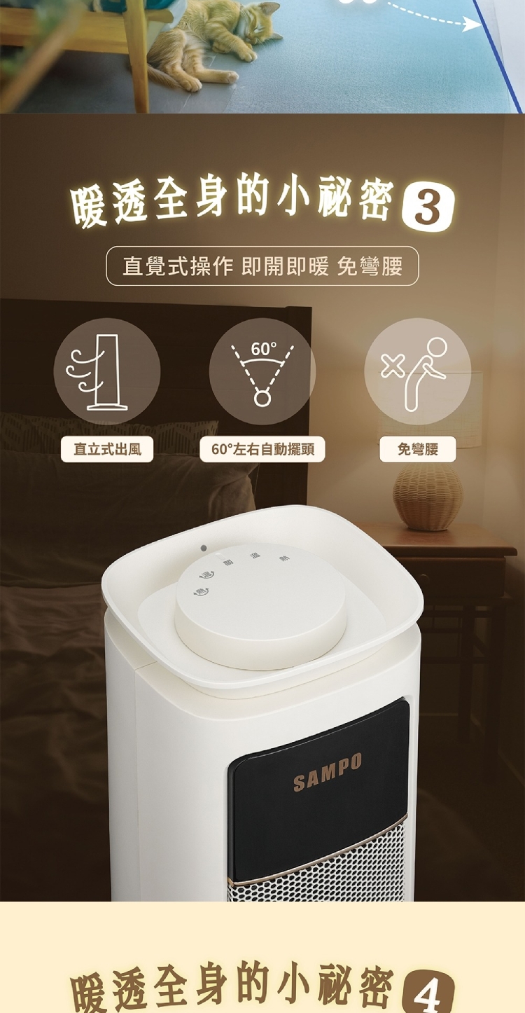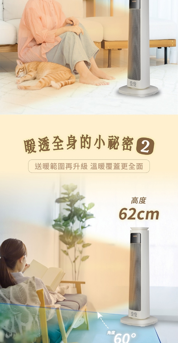 ◆ 60°左右自動擺頭+直立式出風設計,送暖範圍更全面