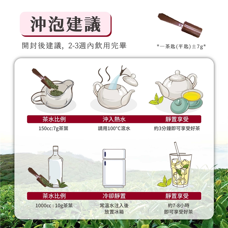 清涼冷泡▶1g茶葉:100cc水,使用常溫水沖泡,室溫靜置1小時後放入冰箱6-8小時取出即可飲用,濃淡度依照個人喜好增減。