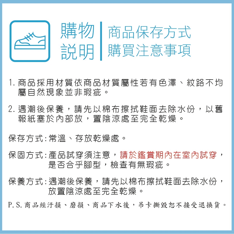 保養方式:遇潮後保養,請先以棉布擦拭鞋面去除水份,以舊報紙塞於內部放置陰涼處至完全乾燥