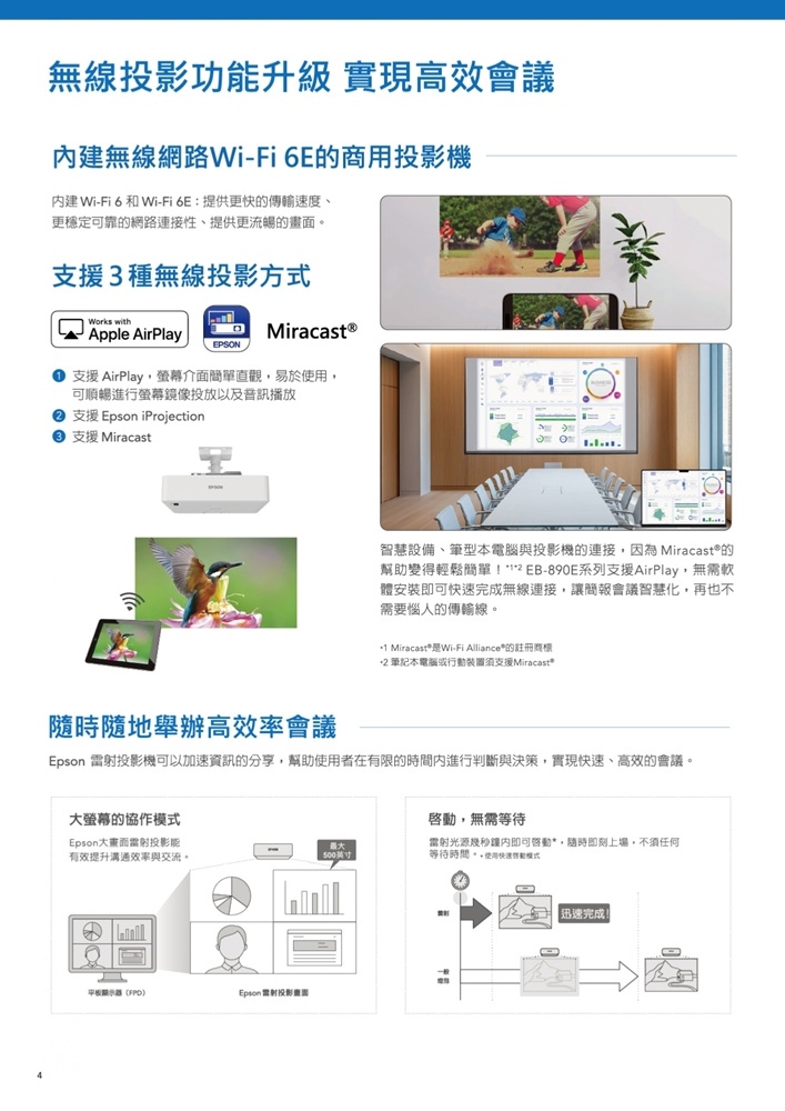 完善無線投影: 支援Wifi6&6E,無線傳輸更快更穩,支援Airplay/Miracast/iProjection三種投影方式,提供最流暢的畫面體驗