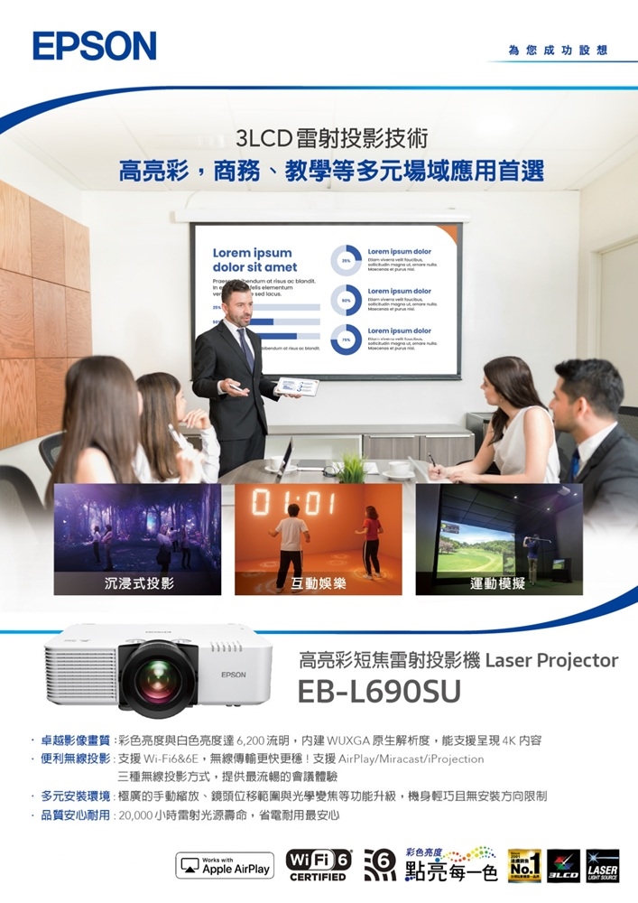 卓越影像畫質: 彩色亮度與白色亮度達6,200流明, WUXGA原生解析度與超過5,000,000:1的高對比度,Epson 3LCD技術投影出絕美畫質