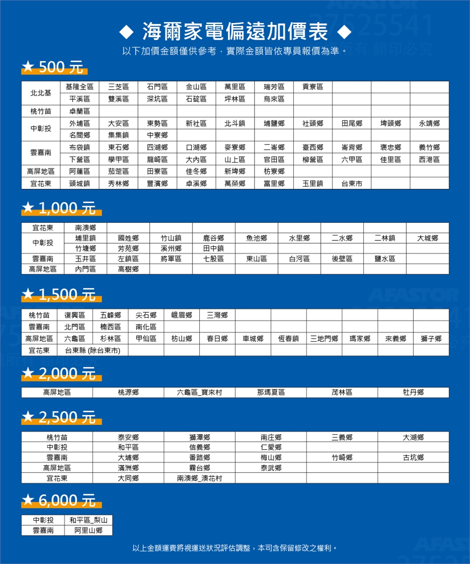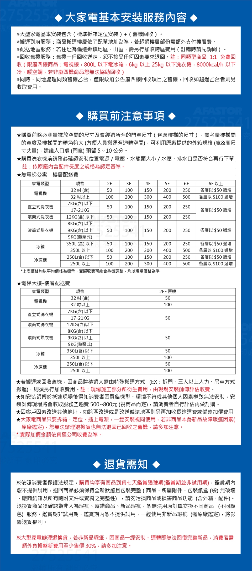 ◎樓層搬運加價:直立式洗衣機/乾衣機:無電梯B1地下室、每層樓加收100元,上限200元。滾筒洗衣機:無電梯B1地下室、每層樓加收100元。