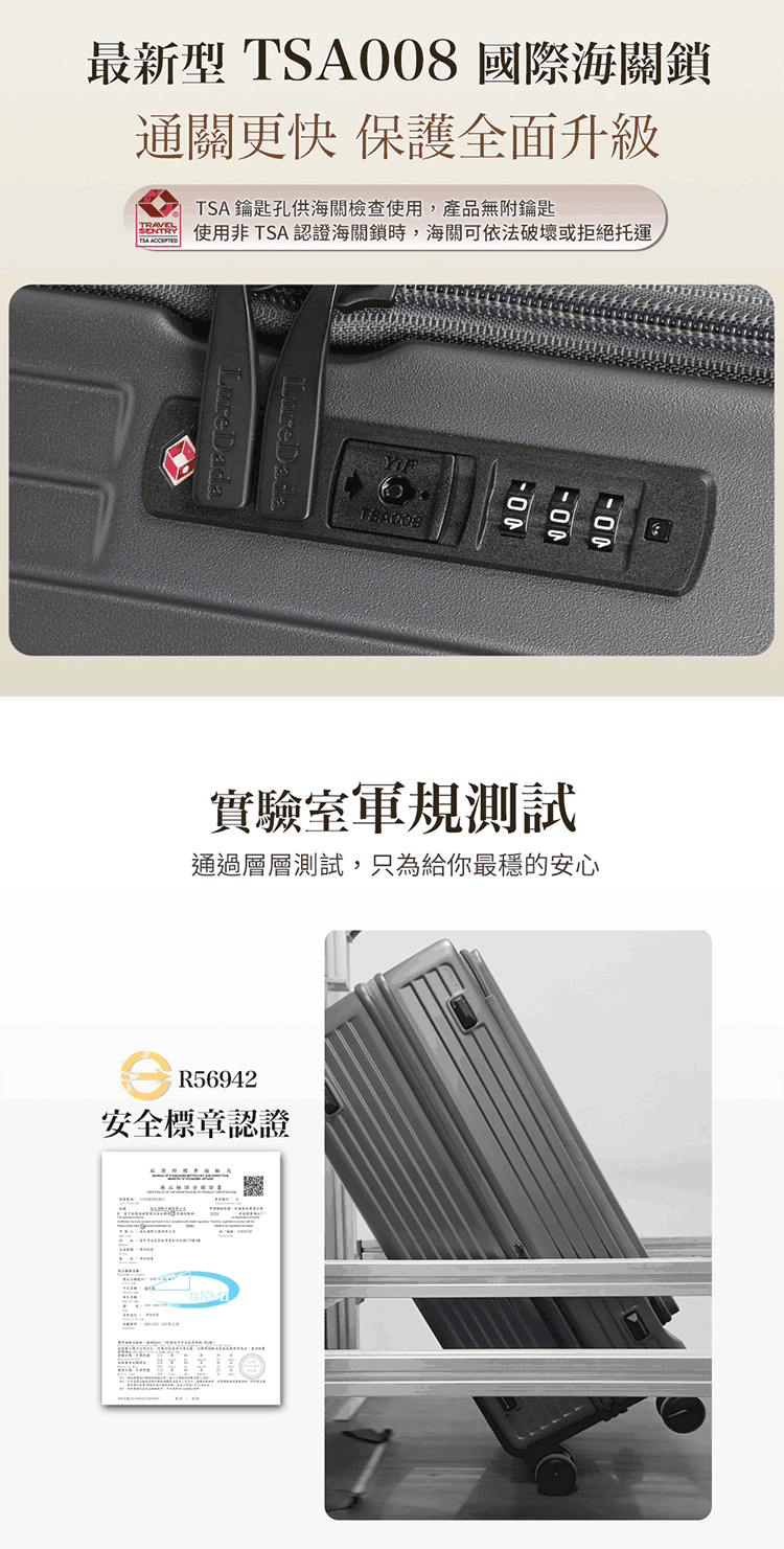 ● 國際認證新型TSA008海關密碼鎖,新型結構鎖芯更複雜不亦撬開,升級更安全