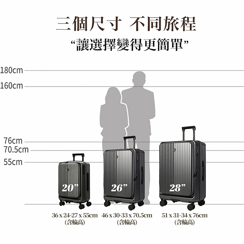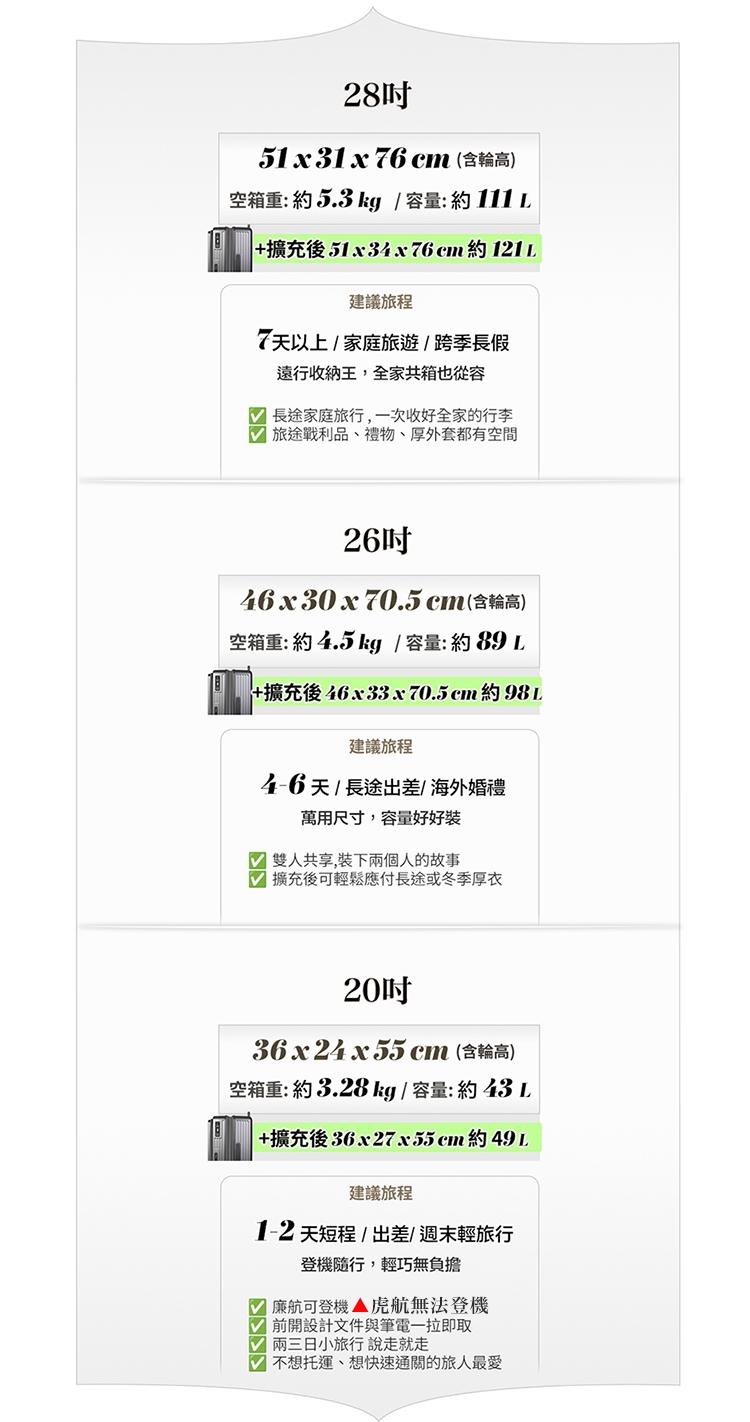 28吋:51 X 31 X 76cm(含輪)、重量約 5.3kg,建議載重:17kg