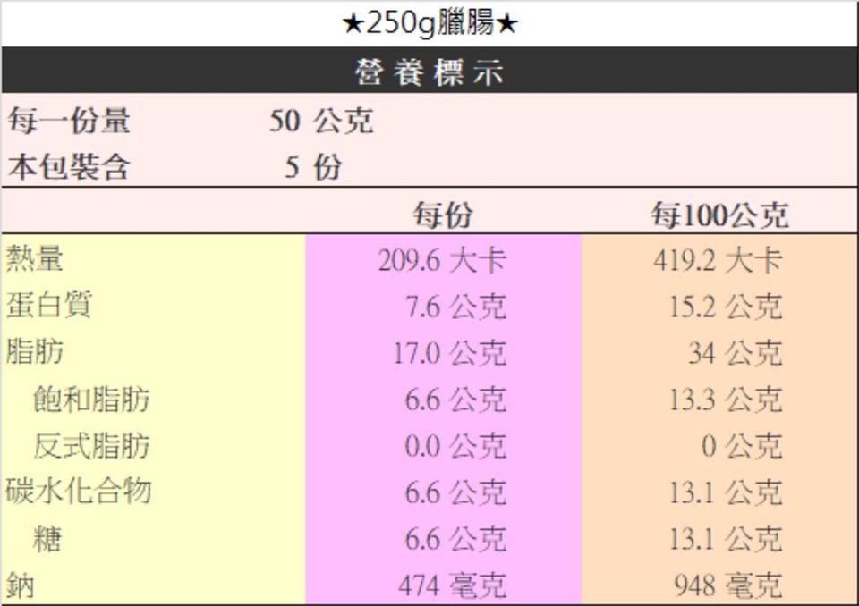 內容物: 豬肉、豬背脂、鴨肝、糖、醬油(水、非基因改造黃豆(高蛋白豆片)、小麥、食鹽、酒精)、甘草水(水、甘草)、高粱酒(高粱、小麥)、米酒、食鹽、白胡椒粉(白胡椒、地瓜澱粉)、可食性牛膠原蛋白腸衣