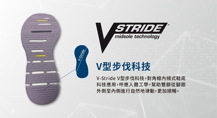 5.V-STRIDE對角線內傾式鞋底科技應用,呼應人體工學,幫助雙腳從腳跟外側至內側進行自然地律動,更加順暢。