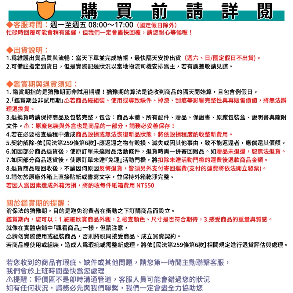 ⚠鑑賞期非試用期,退換貨商品一經組裝及其它原因,導致商品缺乏完整性及失去再販售價值時(如掉漆、刮痕),恕無法退(換)貨。