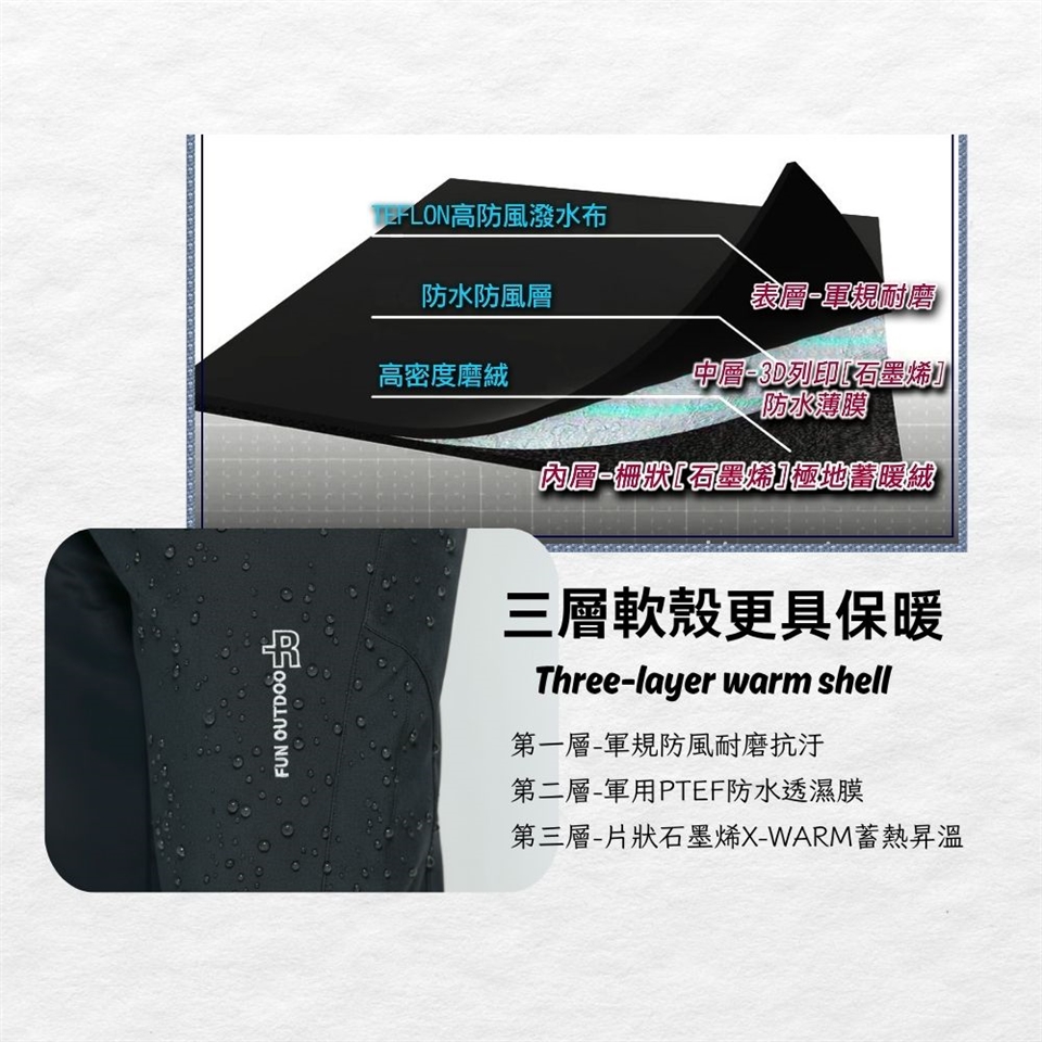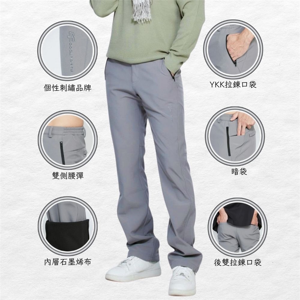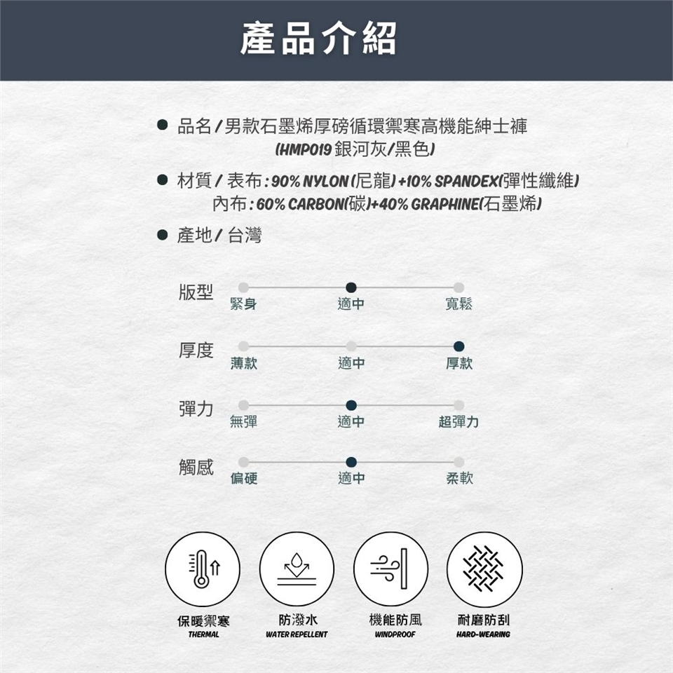 男款材質:表布- 90% NYLON (尼龍) +10% SPANDEX(彈性纖維) , 裡布 - 60% CARBON(碳)+40% GRAPHINE(石墨)
