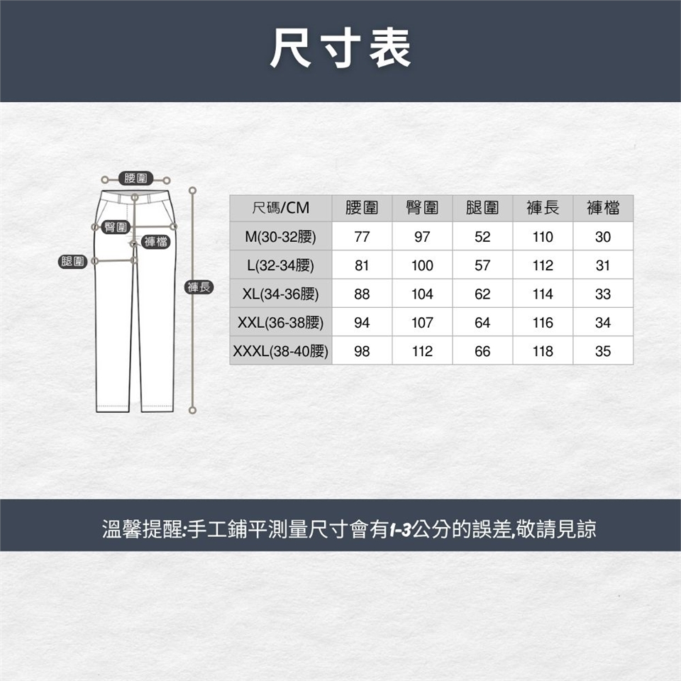 ** 男款試穿建議 : 173cm/73kgs, 實量腰圍 33腰, 褲子穿著L腰, 合身舒適.