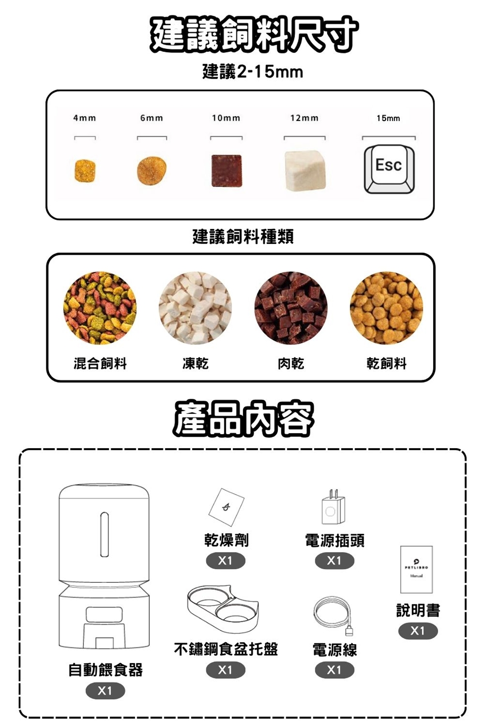 2.出糧格轉一圈代表一份;一份糧約10-15g,每款飼料因大小、重量不同會有些許變動。