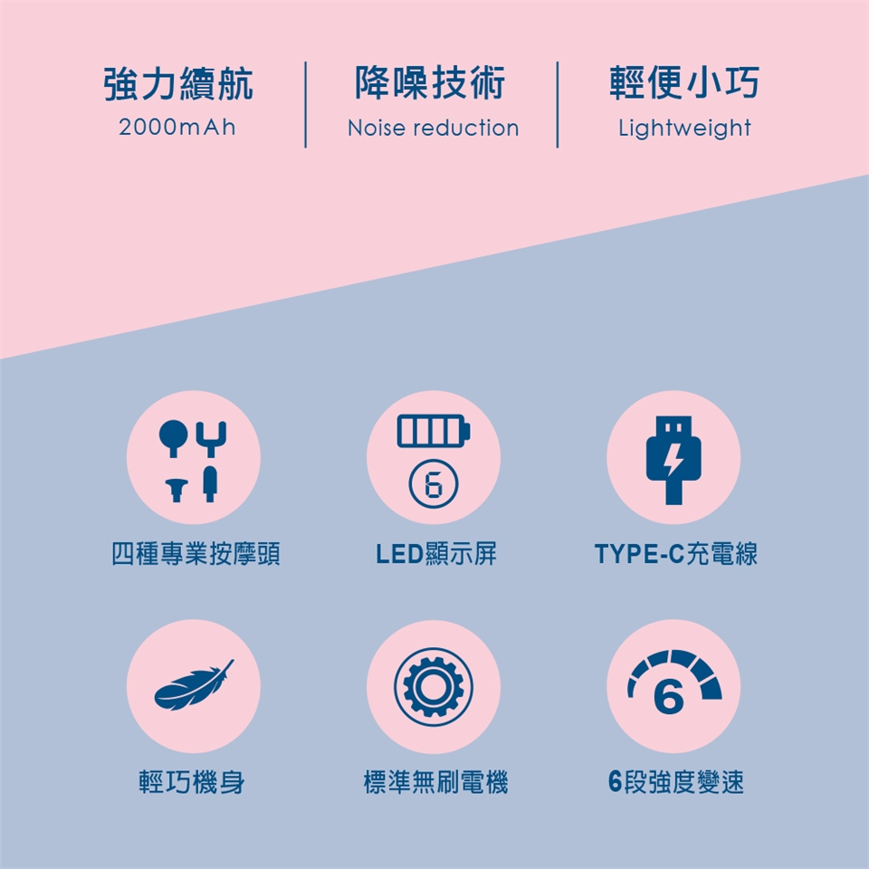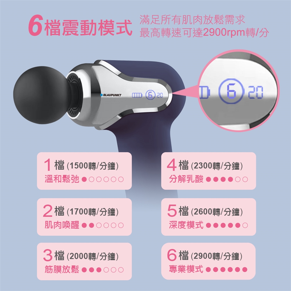 按摩槍轉數 : 1檔1500rpm,2檔1700rpm,3檔2000rpm,4檔2300rpm ,5檔2600rpm,6檔2900rpm 轉/分