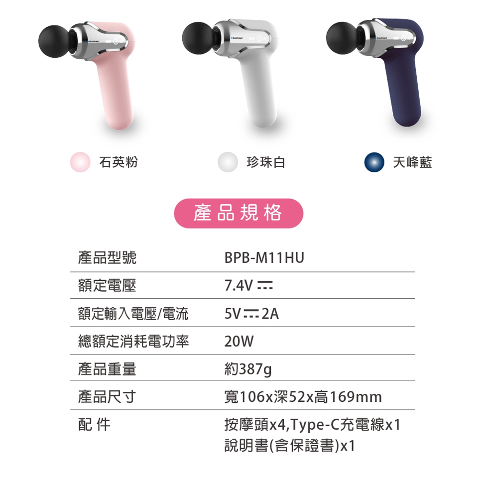 BLAUPUNKT 藍寶 mini USB隨身筋膜震動按摩槍 天峰藍/石英粉/珍珠白 BPB-M11HU