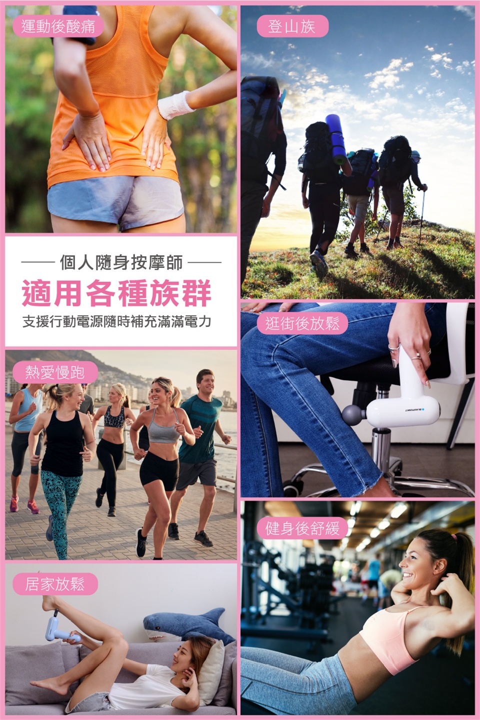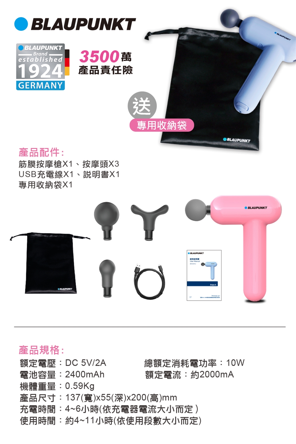 配件: USB充電線*1,收納袋*1,通用按摩頭*1 激痛點按摩頭*1,阿基里斯按摩頭*1 ,使用說明書(含保證書)*1