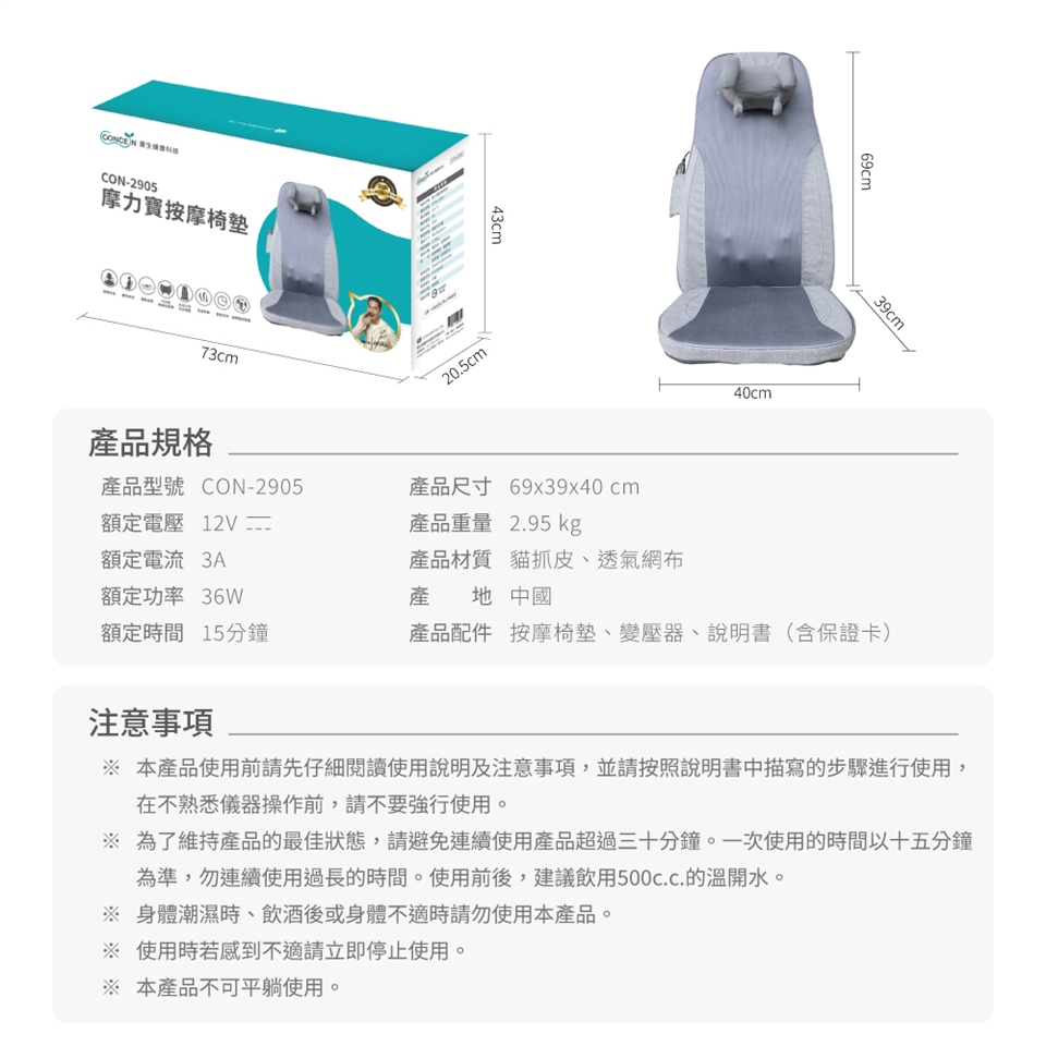 產品配件:按摩椅墊、變壓器、說明書