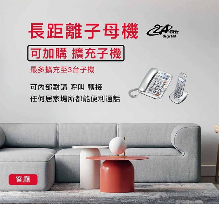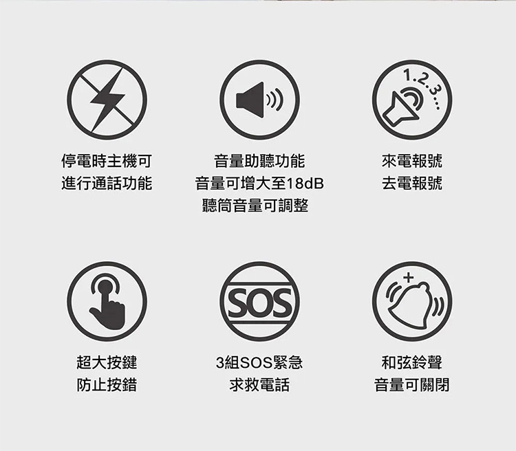 免持功能、來電報號、去電報號、超大字鍵、內部對講、呼叫轉接、保留音樂、鬧鐘