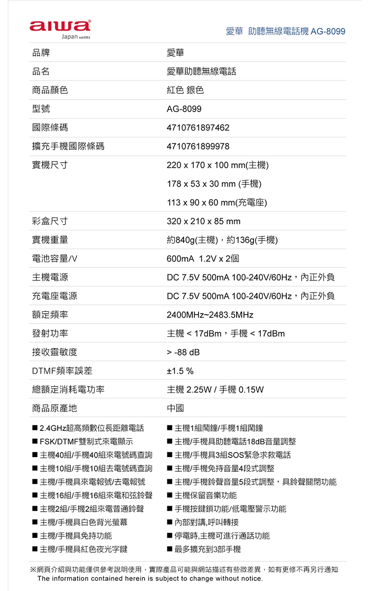 【AIWA】愛華助聽無線電話(會議電話 座機 固定電話/AG-8099)
