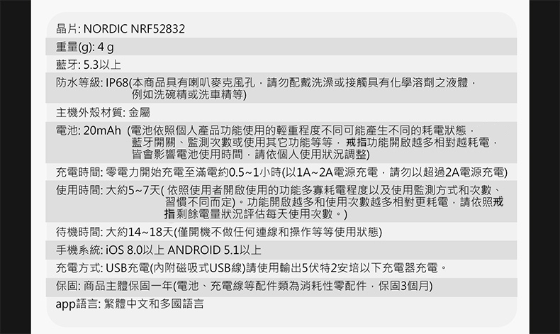 本產品為手機延伸之周邊消費性電子產品,做為手機功能輔助或延伸之周邊,非醫療器材,應用於運動訊息之收集監測。所有智能數據僅供參考,不具備醫療、診斷、緩和、療程、預防和臨床等相關用途。