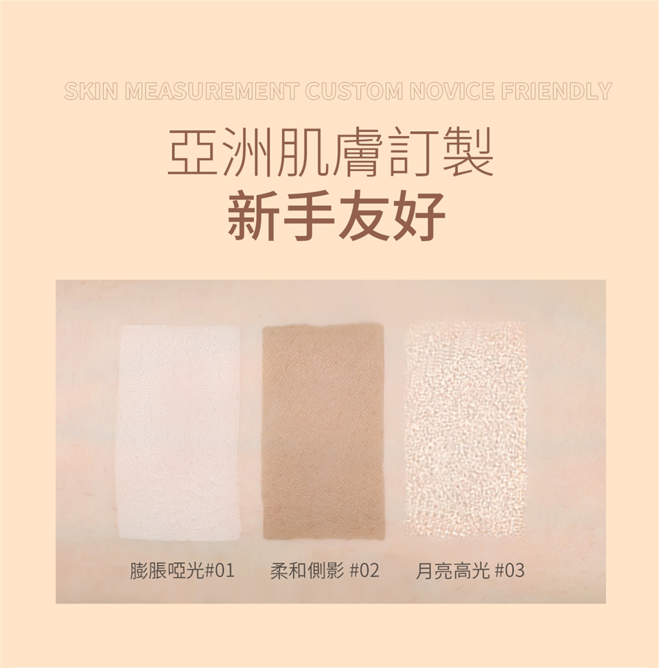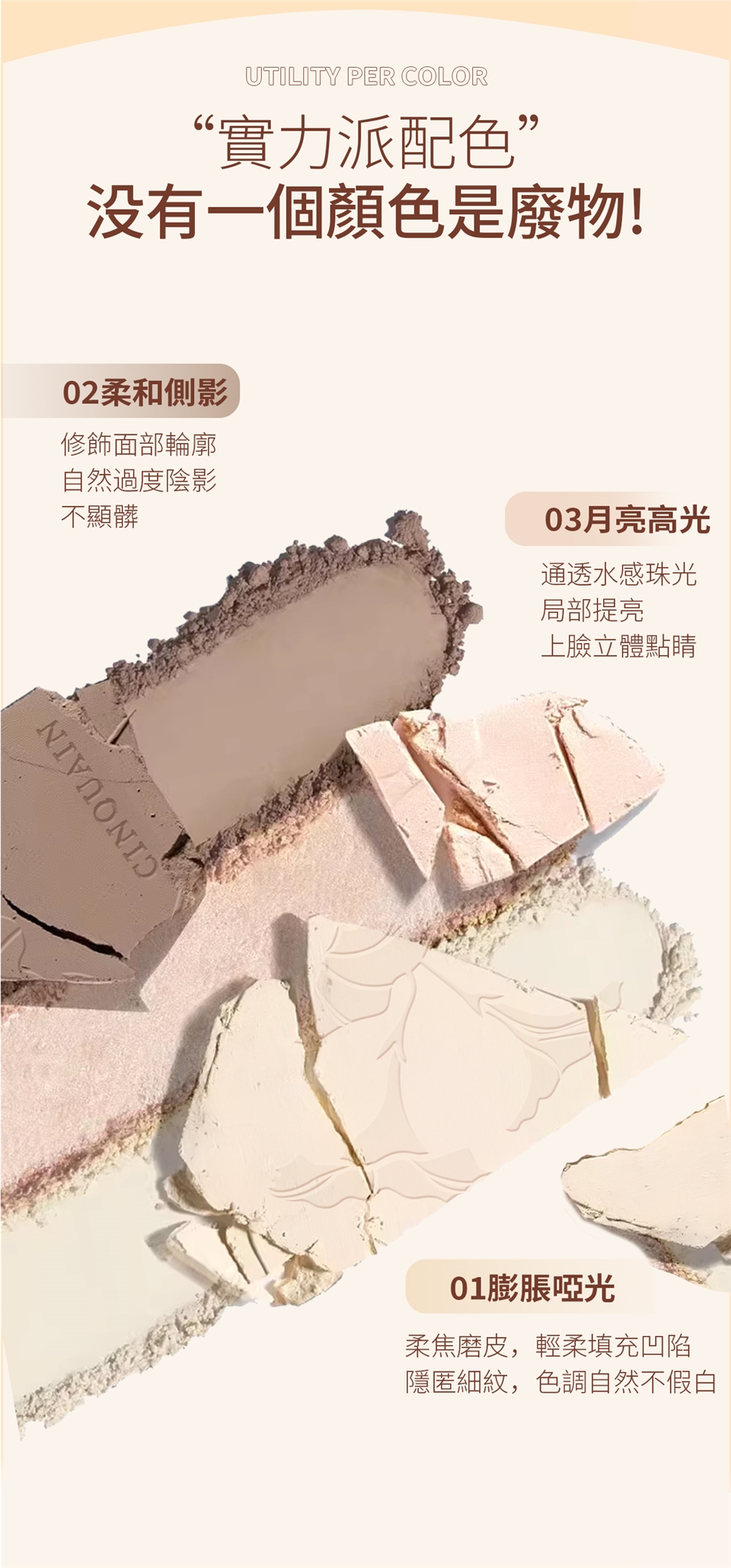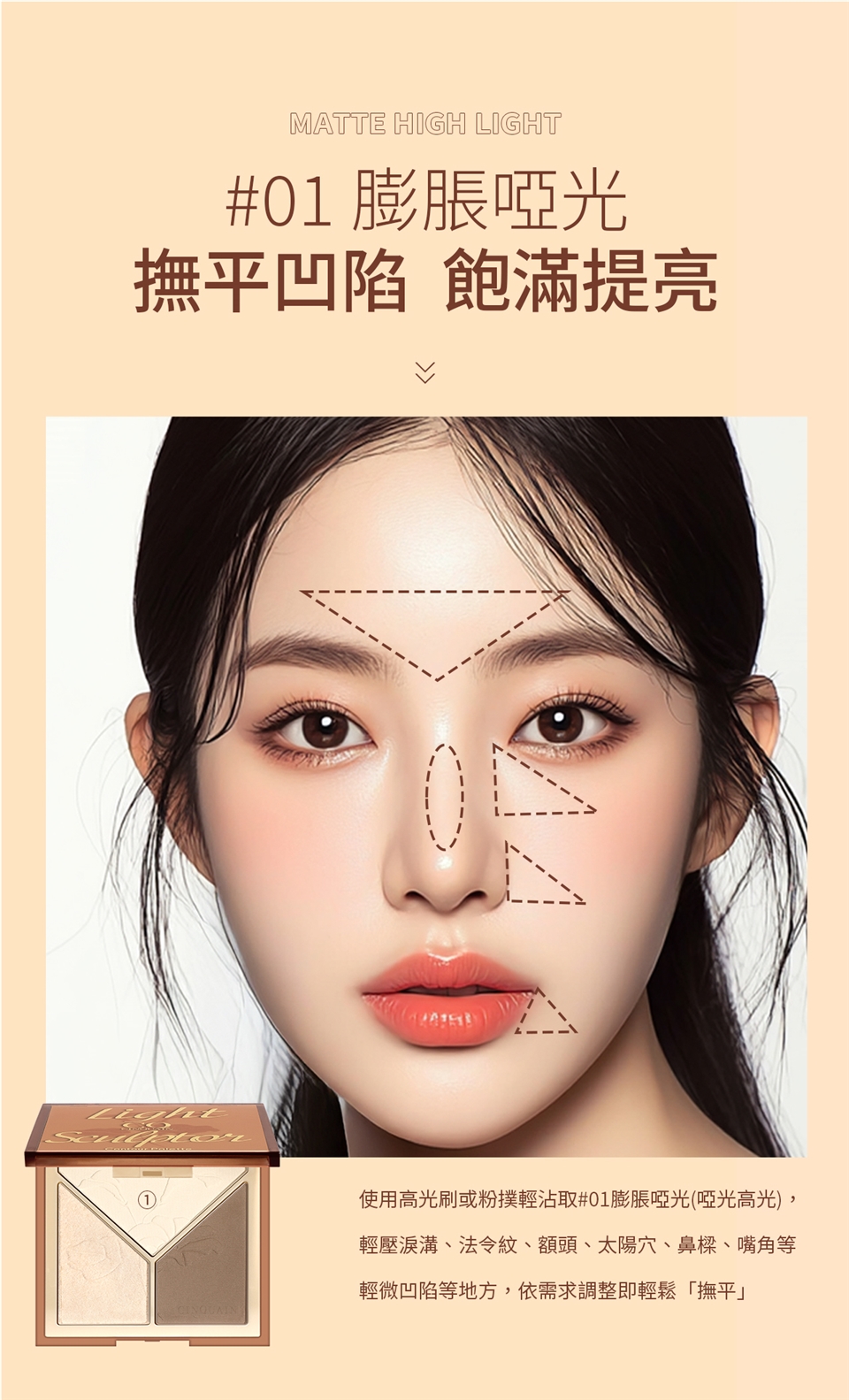 *自然膨脹:高光刷或啞光高光粉撲輕蘸膨脹啞光,輕壓凹陷、紋路、額頭、太陽穴、鼻梁、嘴角,輕微凹陷,輕松嘭起來。