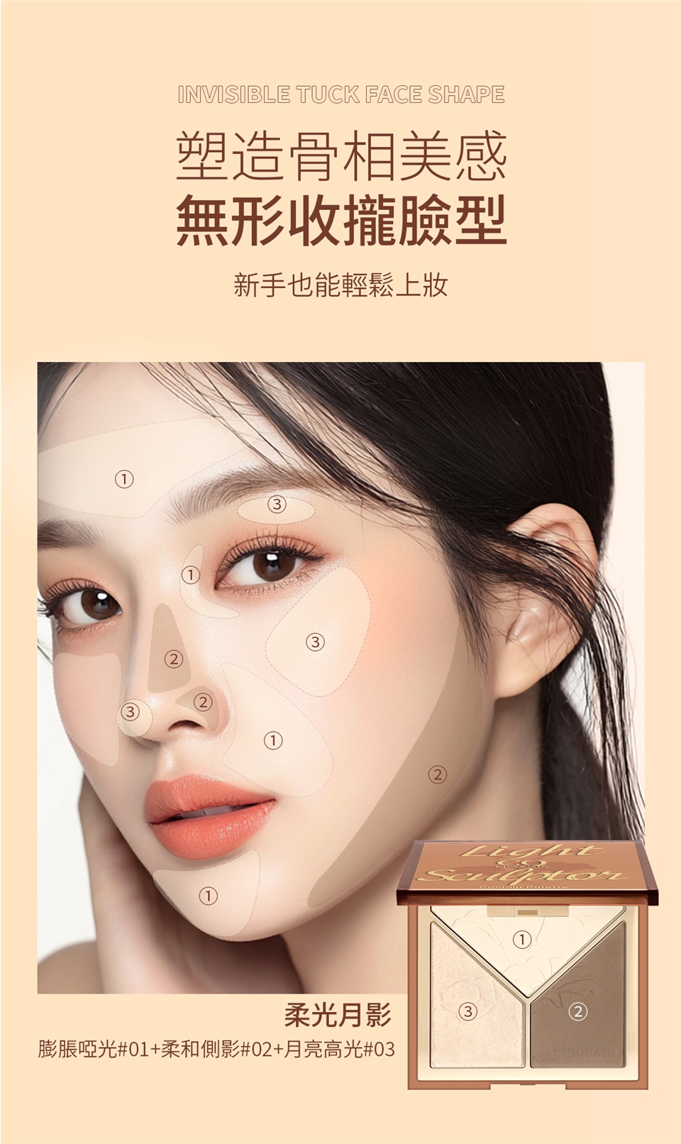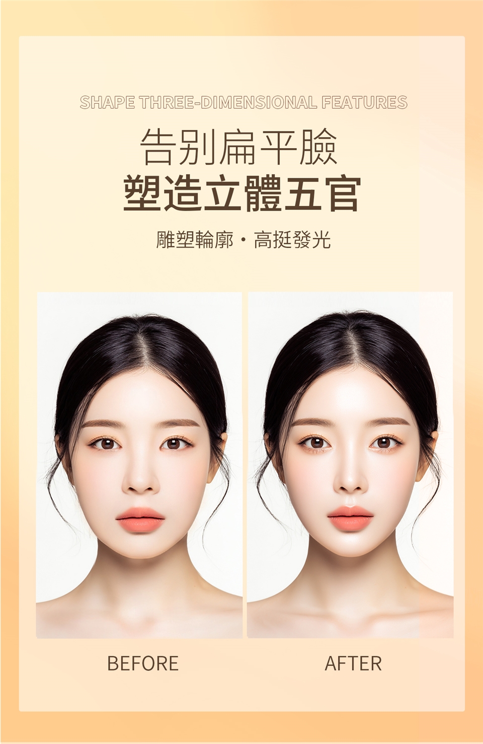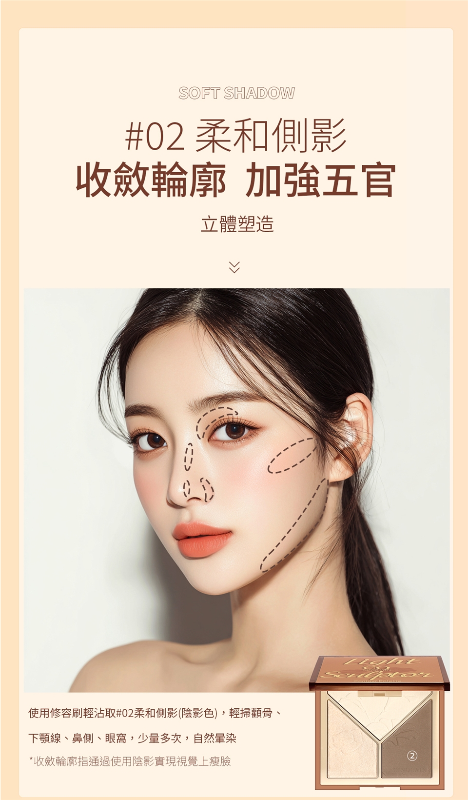 *立體五官:修容刷輕蘸陰影色,輕掃顴骨、下頜線、鼻側、眼窩,少量多次,自然暈染。