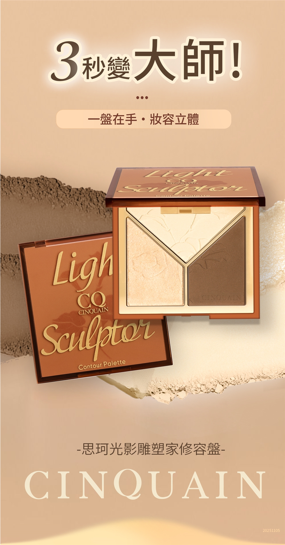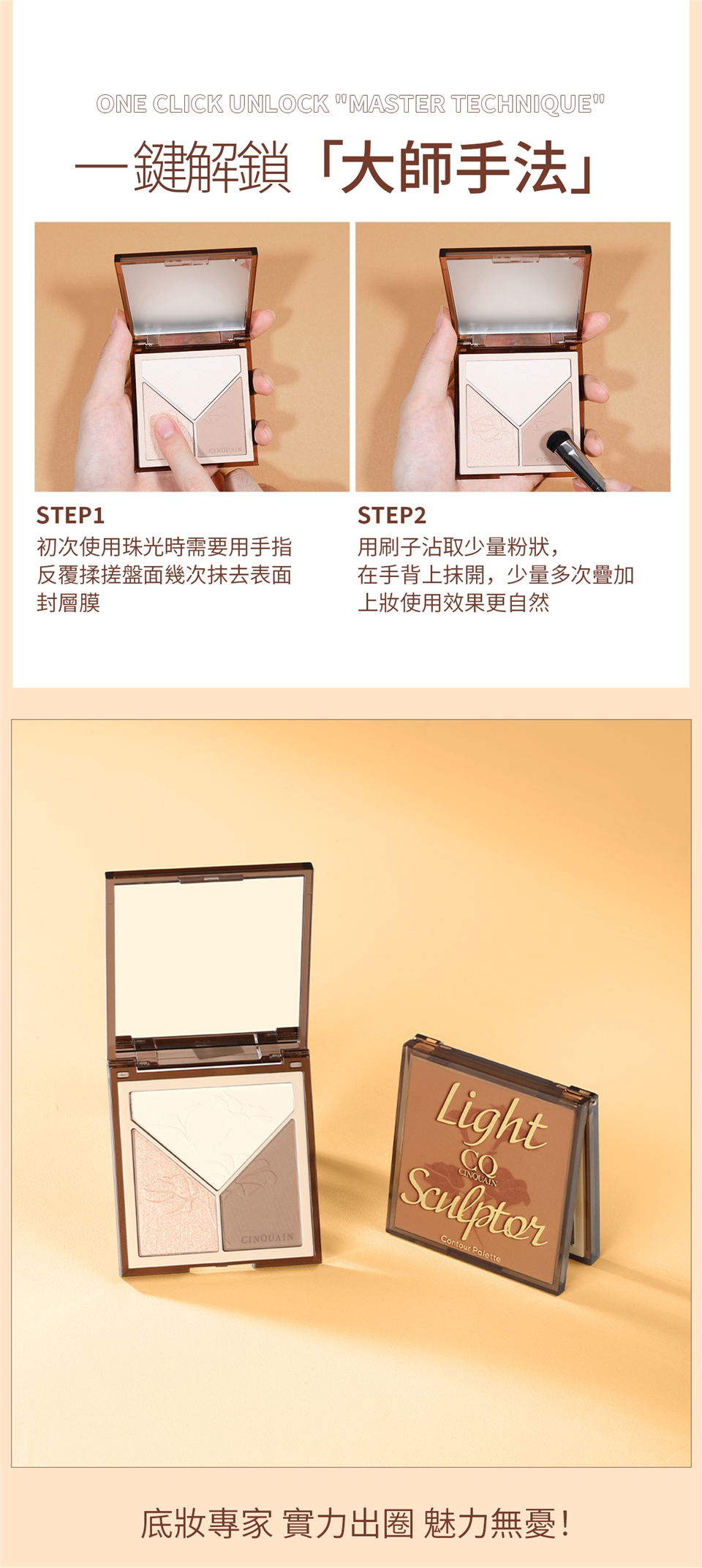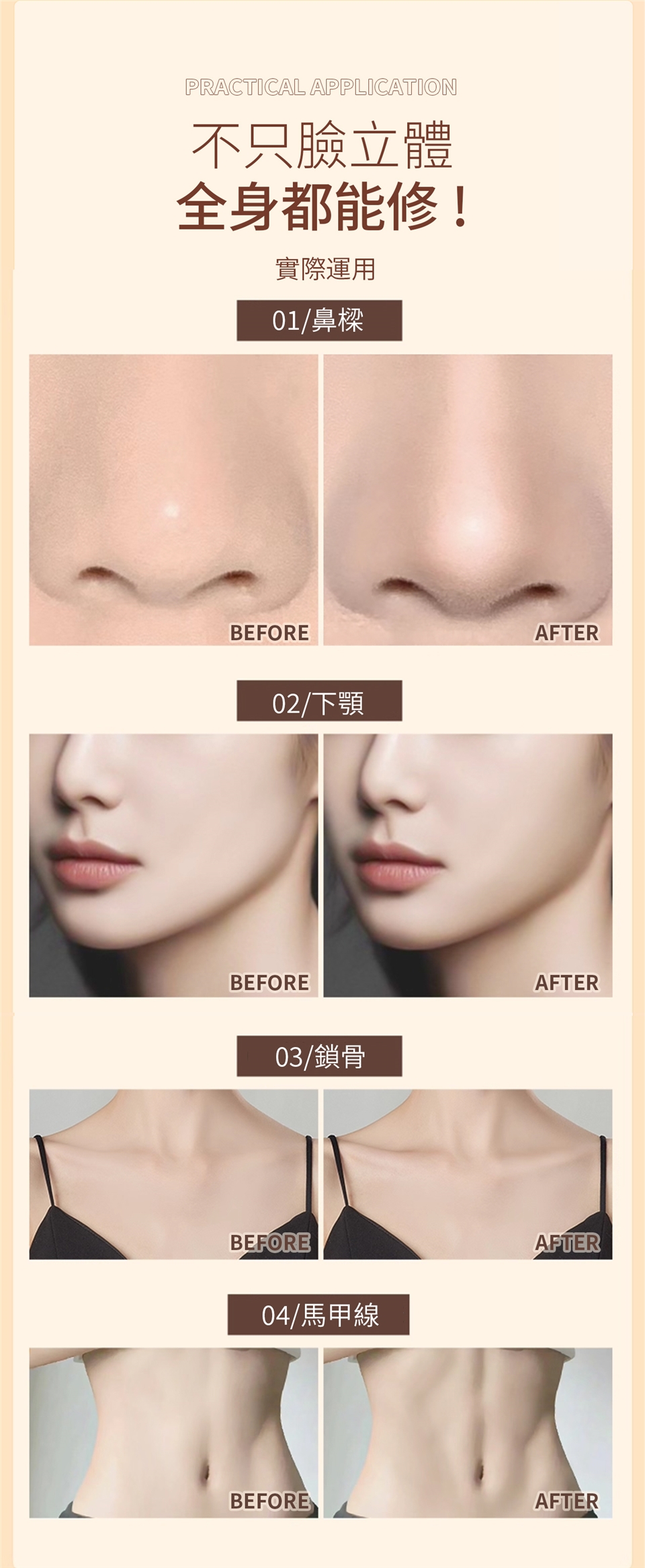 *立體五官:修容刷輕蘸陰影色,輕掃顴骨、下頜線、鼻側、眼窩,少量多次,自然暈染。