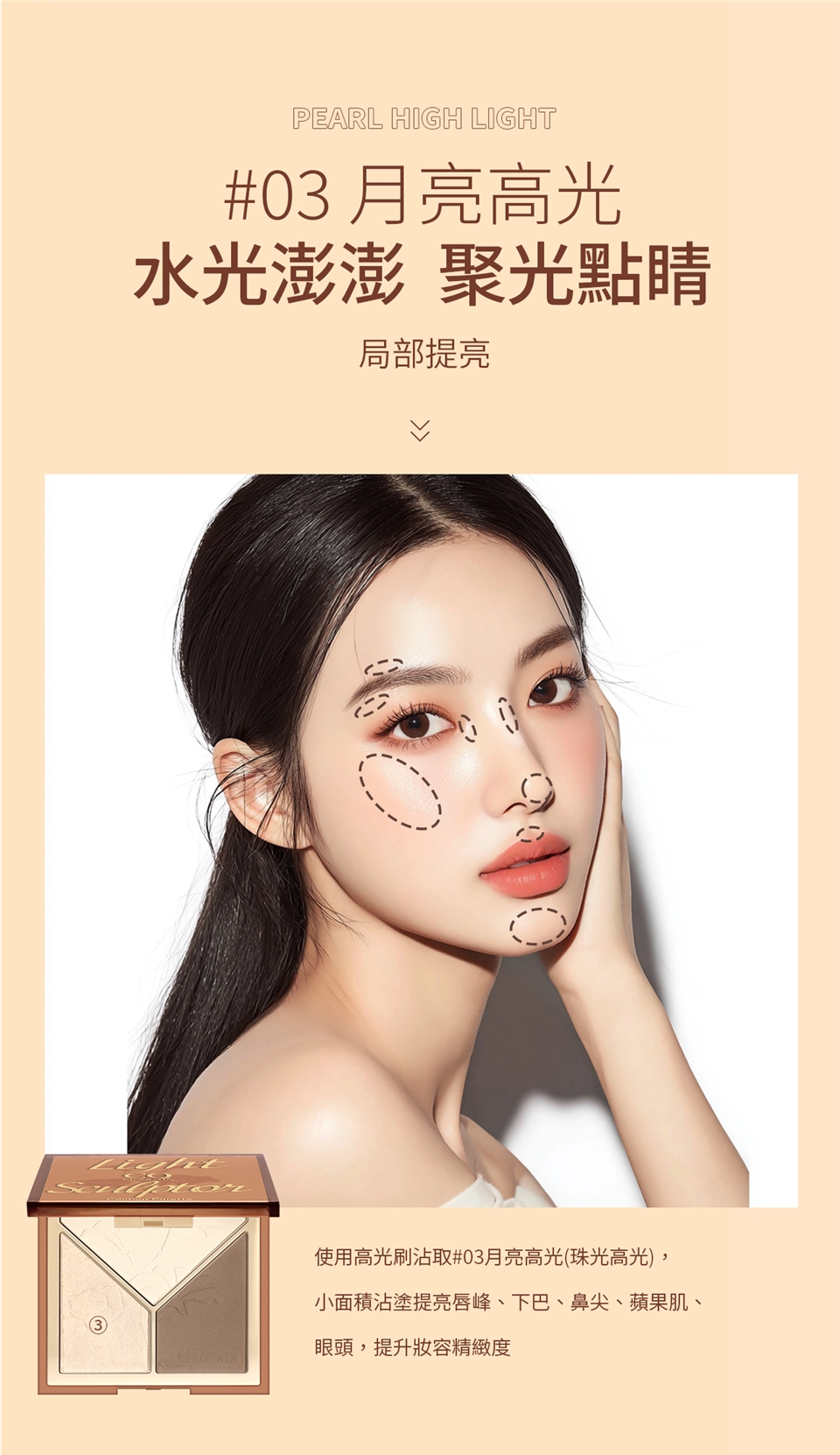 *打亮肌膚:高光刷適量蘸取月亮高光,小面積點塗唇峰、下巴、鼻尖、蘋果肌、眼頭,提升精緻妝容。