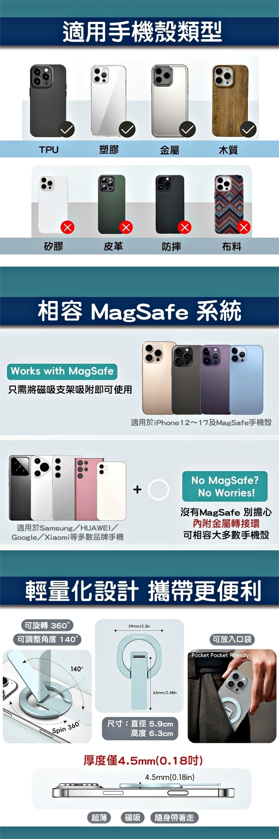 強磁吸:強大的磁鐵和人體工學設計可穩穩固定手機,確保不會滑落。