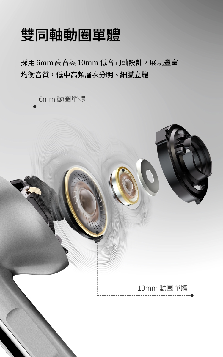 同軸雙驅・震撼音場|採用 6mm + 10mm 同軸雙動圈單體,呈現高低音層次分明、低音澎湃、高音清脆的細膩音質,無論是音樂欣賞、影音娛樂或線上會議,都能享受沉浸式音效。