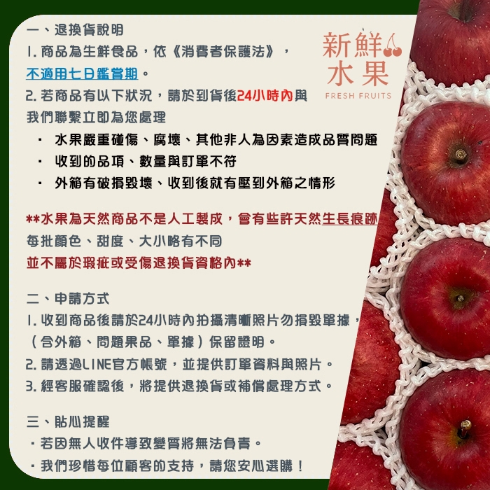 我們用心挑選每一顆新鮮果實,將最好的品質送到您手中。為保障您的權益,請詳閱以下退換貨說明: