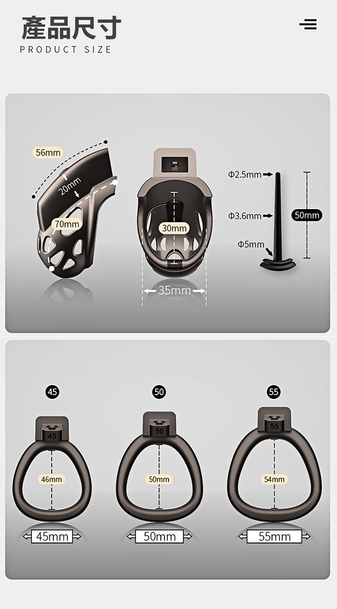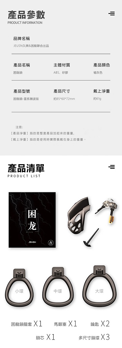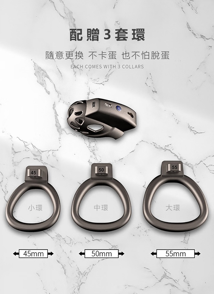 內容物:三尺寸套環各x1只(共3只)、鑰匙x2把、馬眼棒x1、