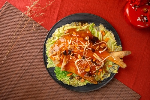 精緻魚翅羹,湯汁濃郁順口,細膩口感展現頂級年節宴客風味,象徵吉祥如意。糖醋真白鯧 600g (固形物400g)