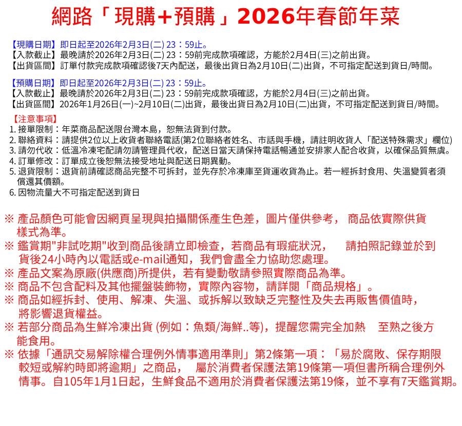 1. 接單限制:年菜商品配送限台灣本島,恕無法貨到付款。