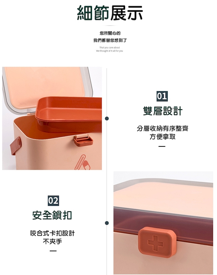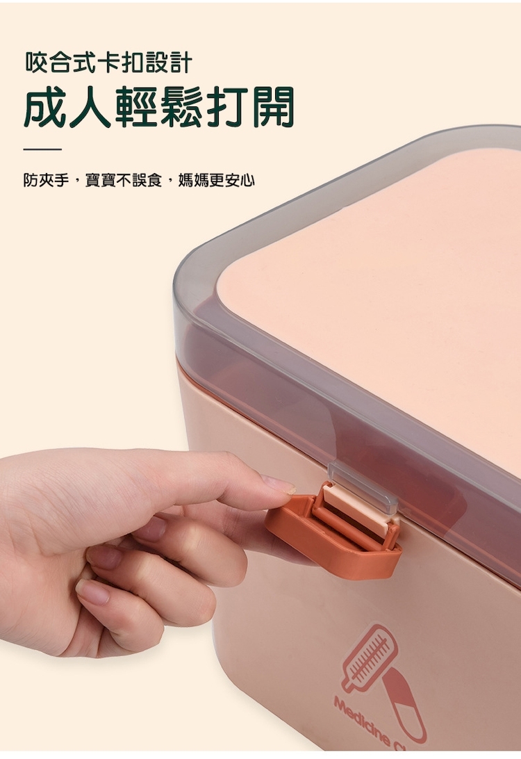 雙層空間設計,大容量分格收納,卡扣式設計,避免幼兒打開誤食,大人輕鬆開蓋不夾手,避光上蓋,密封隔離,防塵防潮不易變質,自帶提把,圓滑親膚,輕鬆提取移動便利,輕巧便攜,可堆疊收納