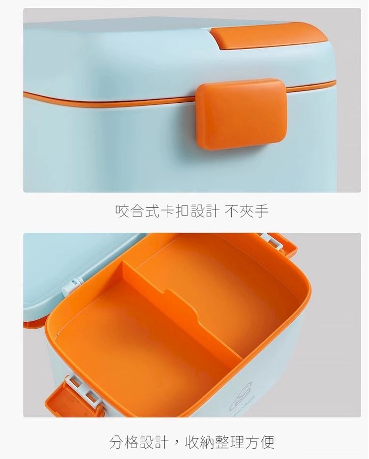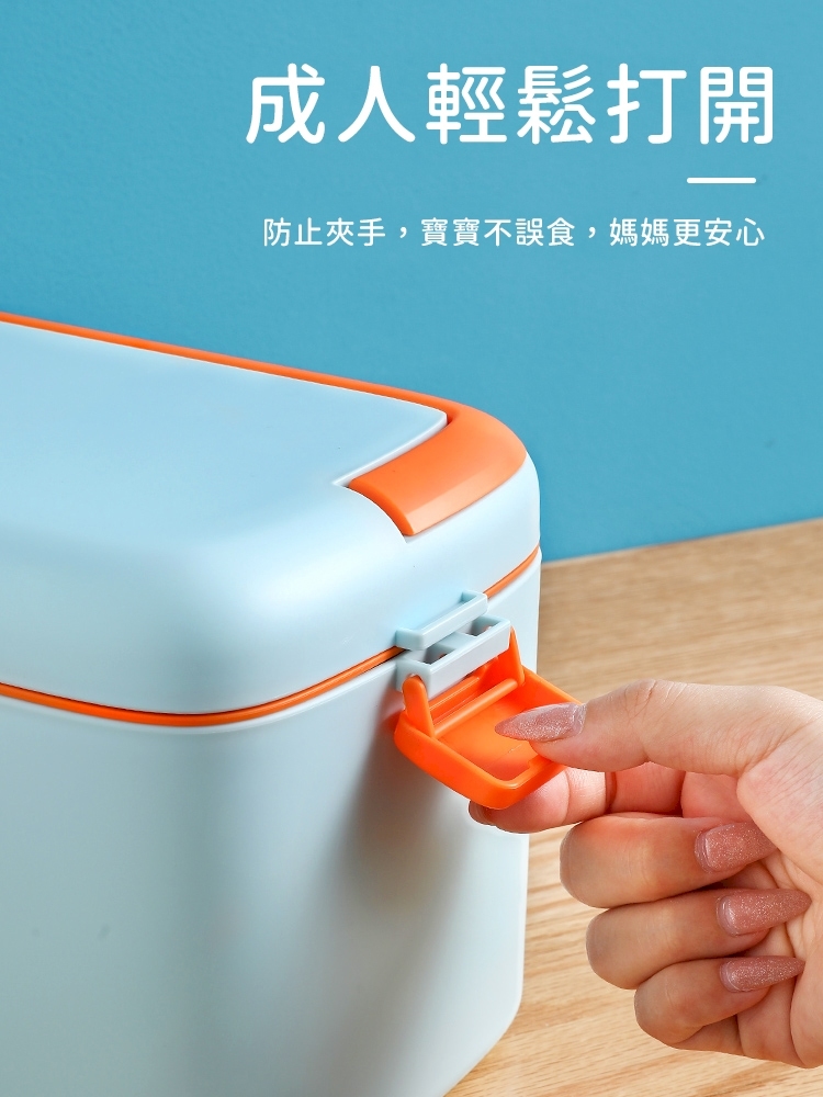 雙層空間設計,大容量分格收納,卡扣式設計,避免幼兒打開誤食,大人輕鬆開蓋不夾手,避光上蓋,密封隔離,防塵防潮不易變質,自帶提把,圓滑親膚,輕鬆提取移動便利,輕巧便攜,可堆疊收納