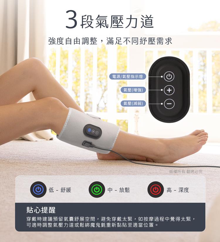 三段氣壓力道(低、中、強),高壓氣囊循環按摩,深度放鬆,
