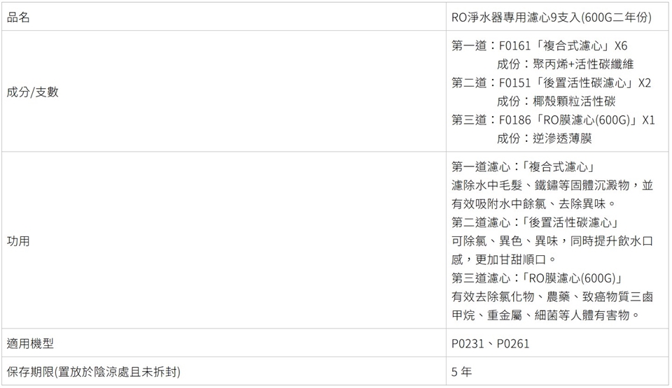 成份:椰殼顆粒活性碳第三道:F0186「RO膜濾心(600G)」X1