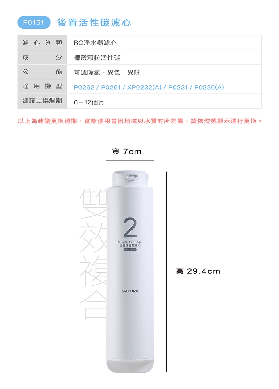 成份:聚丙烯+活性碳纖維第二道:F0151「後置活性碳濾心」X2