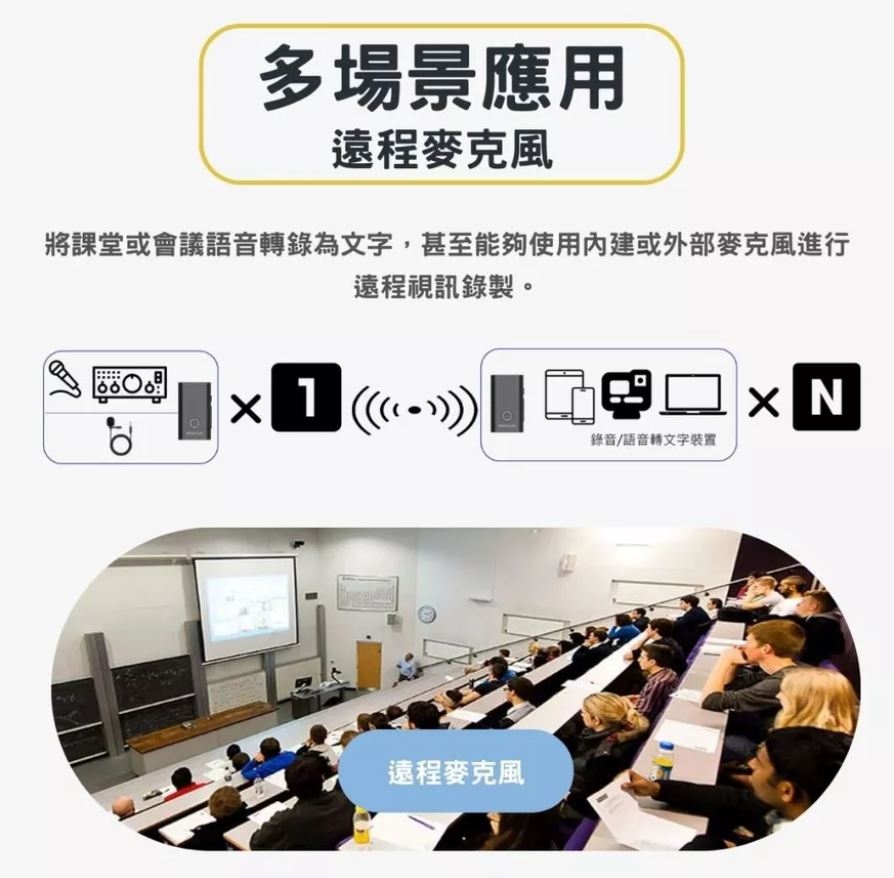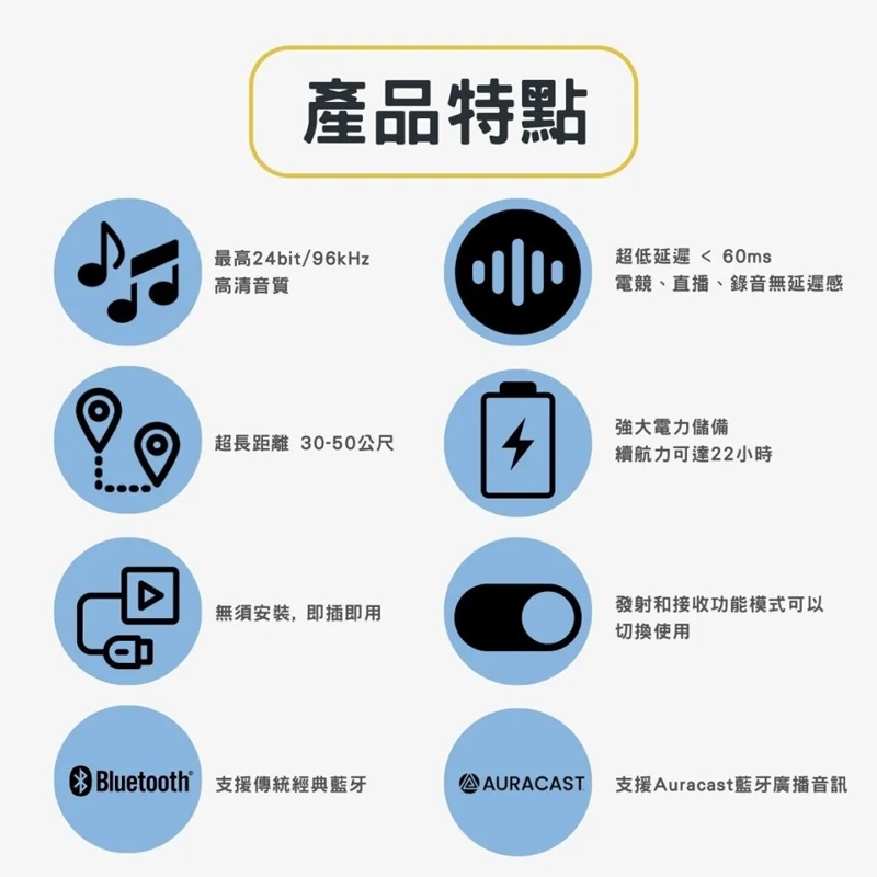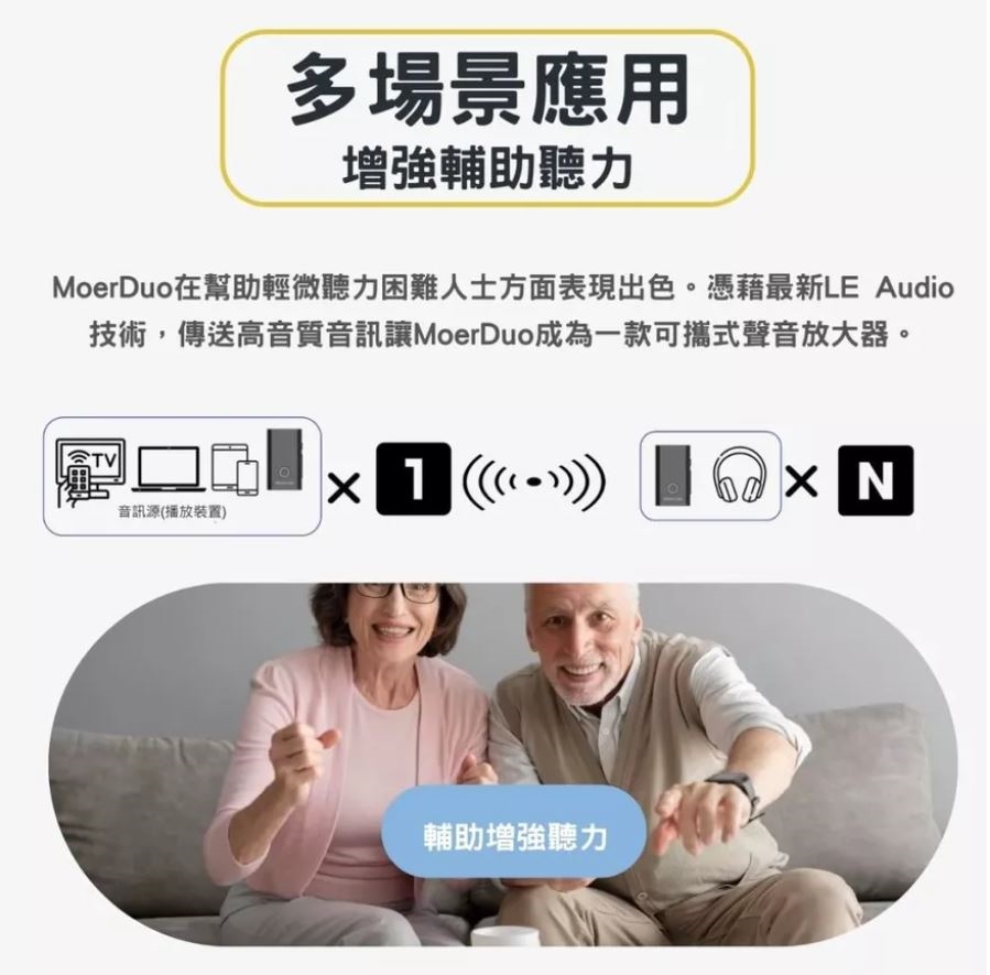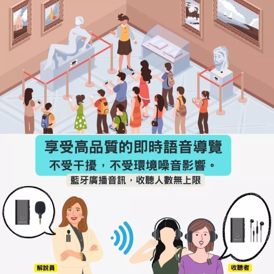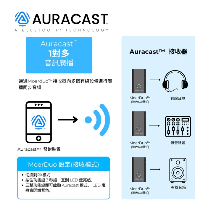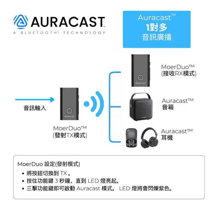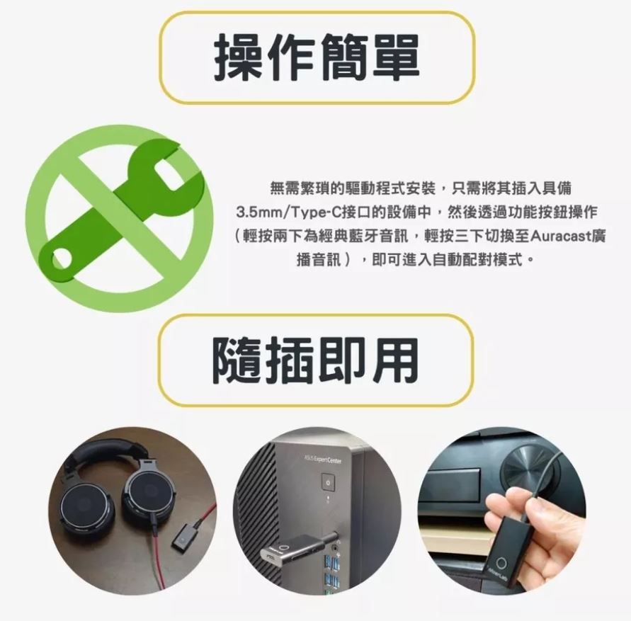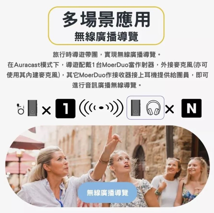 連接手機 / 電腦 / 平板即可將聲音轉換為數位音訊,無論一對一經典藍牙,或Auracast一對多廣播共享,都能轉化有線為無線傳輸,應用在錄音/會議/導覽/直播...中,非常方便!