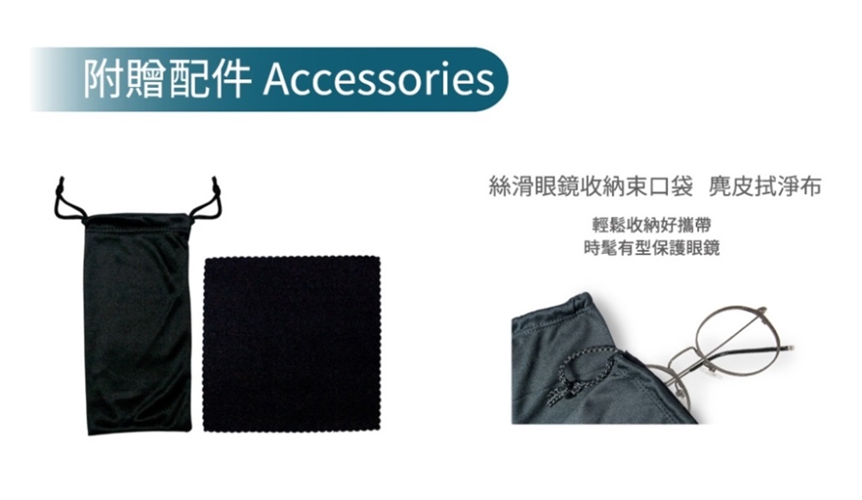 附贈眼鏡收納袋、拭淨布,與眼鏡防塵袋,時髦有型保護眼鏡。