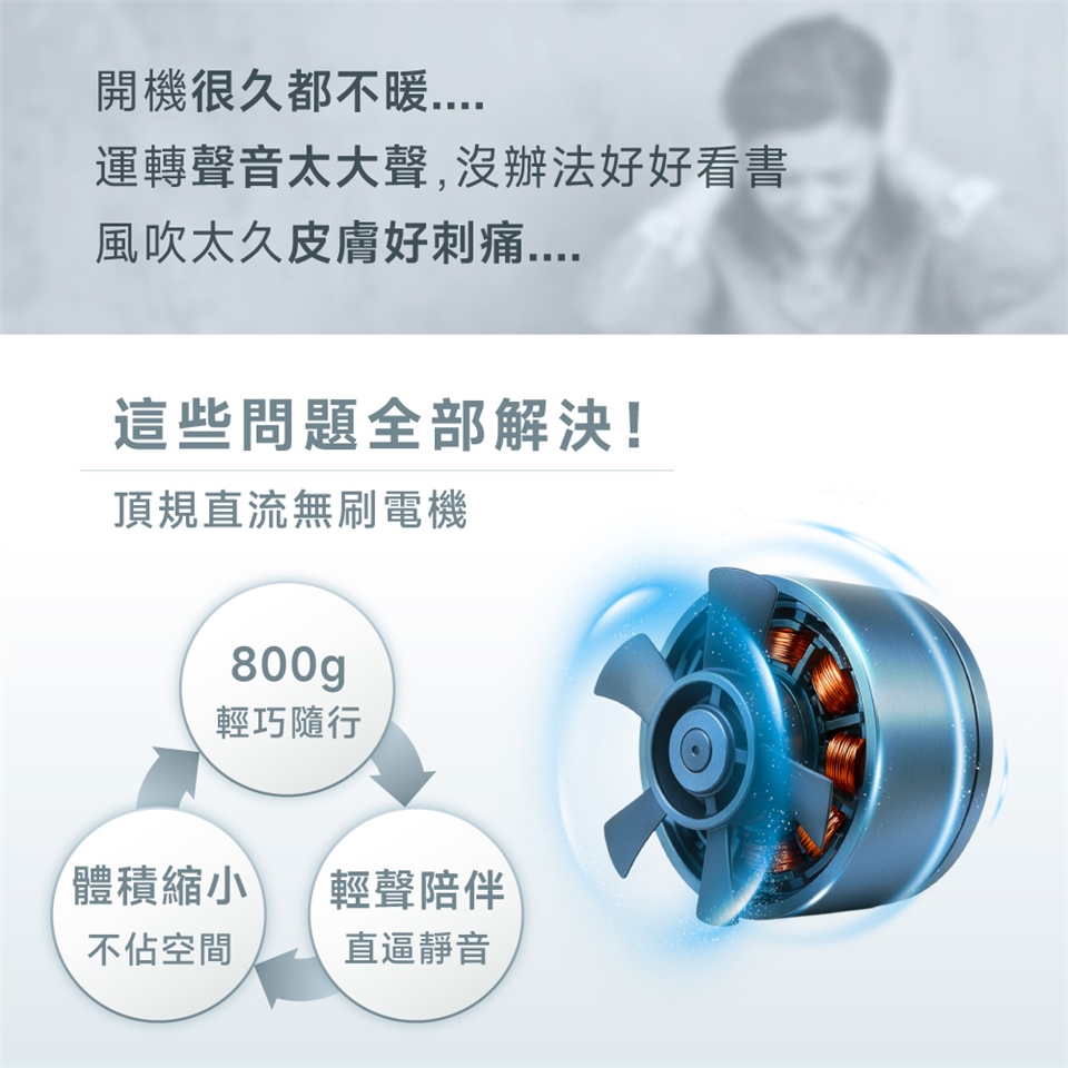 採用頂規直流無刷電機,運轉聲壓逼近圖書館級靜音!深夜辦公、嬰兒房安睡零干擾,電機壽命更比傳統提升2倍。整機淨重僅0.8公斤(等同1瓶礦泉水),單手輕拎說走就走,旅行箱縫隙輕鬆收納。