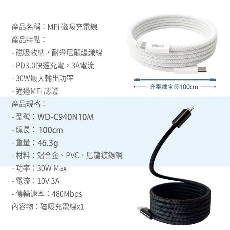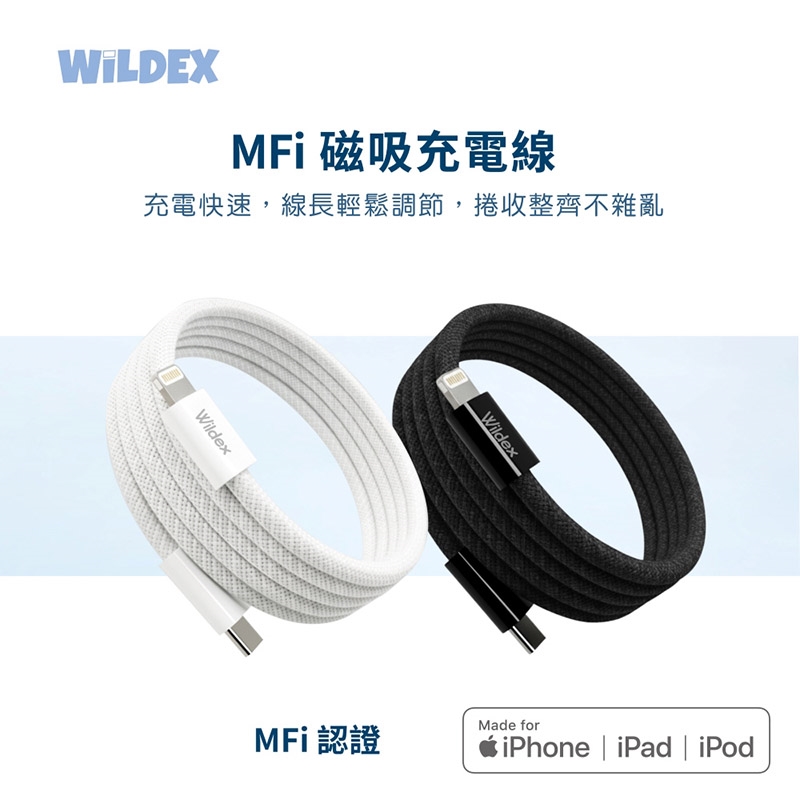 【Wildex】Type-C to Lightning 蘋果認證MFi/磁吸收納快充線/傳輸線/充電線(100公分)