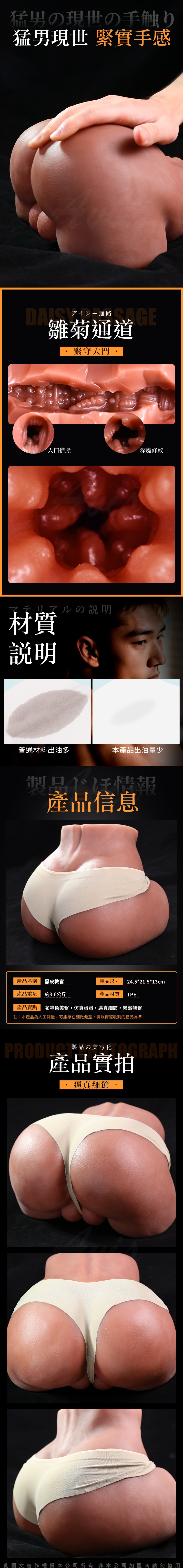 真實觸感,極致還原——黑皮教官以高擬真倒模技術打造,從肌膚紋理到曲線比例,完美重現男性翹臀質感。