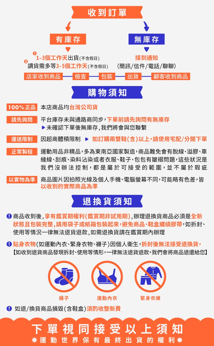 退貨時請注意切勿直接黏貼/書寫文字於商品包裝盒/袋上,並將商品恢復收貨時原包裝,(例如:用一個包裝袋包裝起來)#運動世界 #運動品牌 #台灣正品公司貨如有任何問題歡迎透過客服、Email或者電話詢問,感謝您