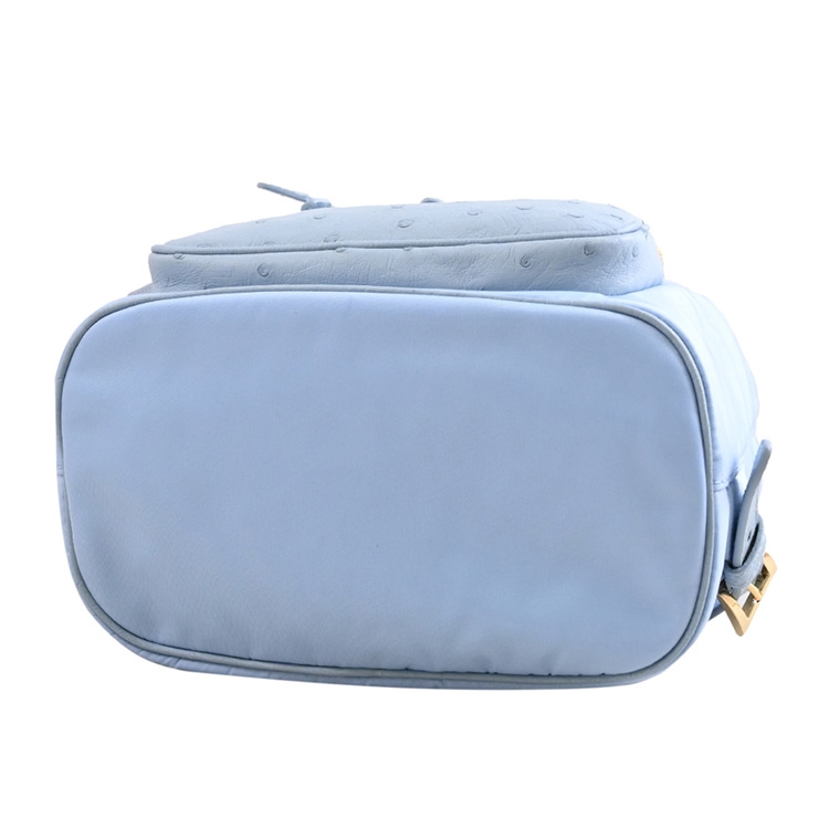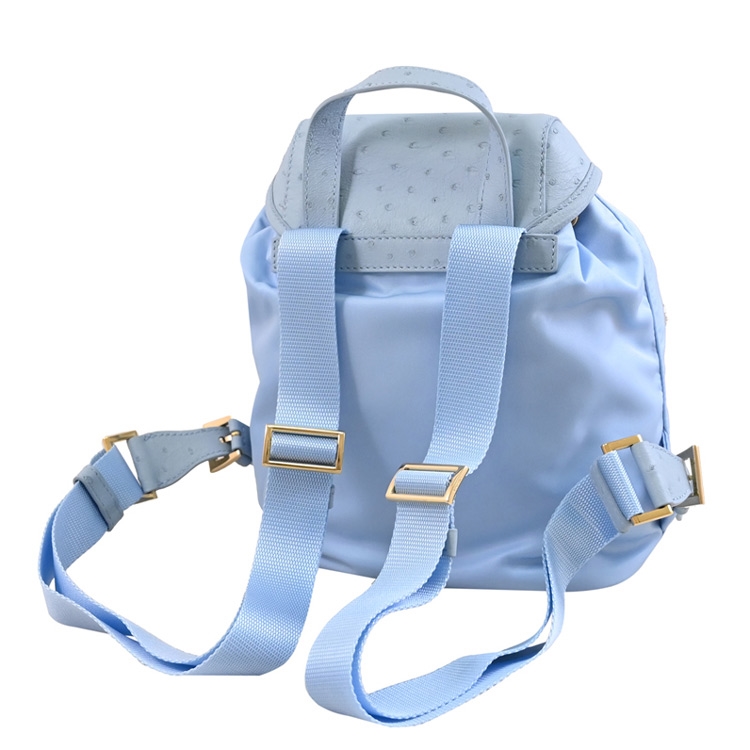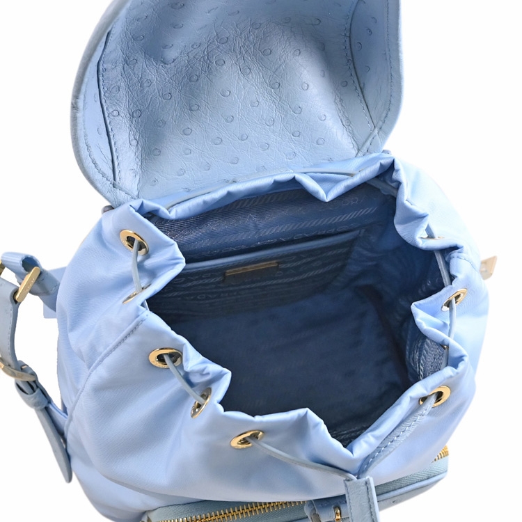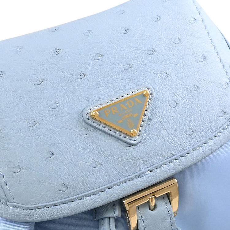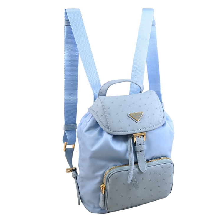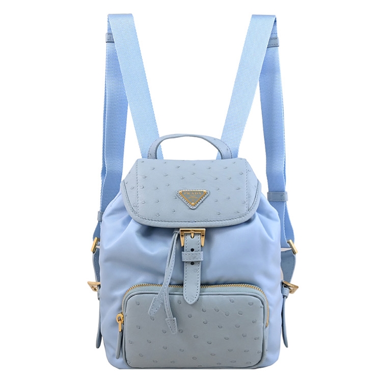 PRADA 專櫃經典熱銷後背包款,採用經典三角LOGO,由再生尼龍和天然圓點紋理鴕鳥皮製成,翻蓋抽繩開口,內有1貼袋+外1拉鍊袋,內可放長夾、小摺疊傘或手機等隨身用品,出遊無負擔包款,釋放出都會優雅的時尚風格,典雅實用。