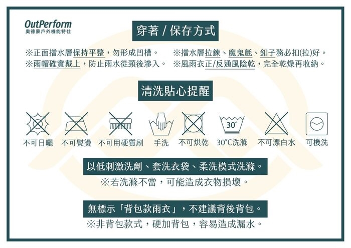 ※請勿使用後雨衣還是潮濕的狀態下,收入機車置物箱或衣櫃中,以免以免降低雨衣使用壽命及產生發霉的狀況