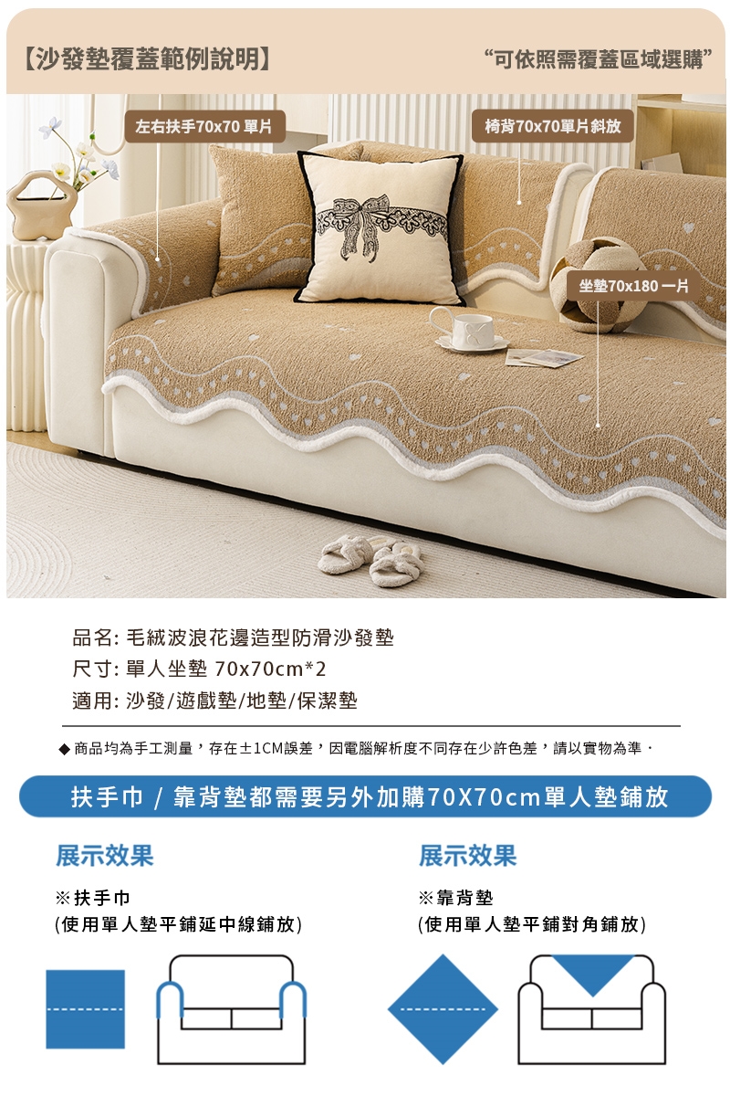如需扶手巾/靠背墊,請"另外加購70x70cm/單人墊"鋪設